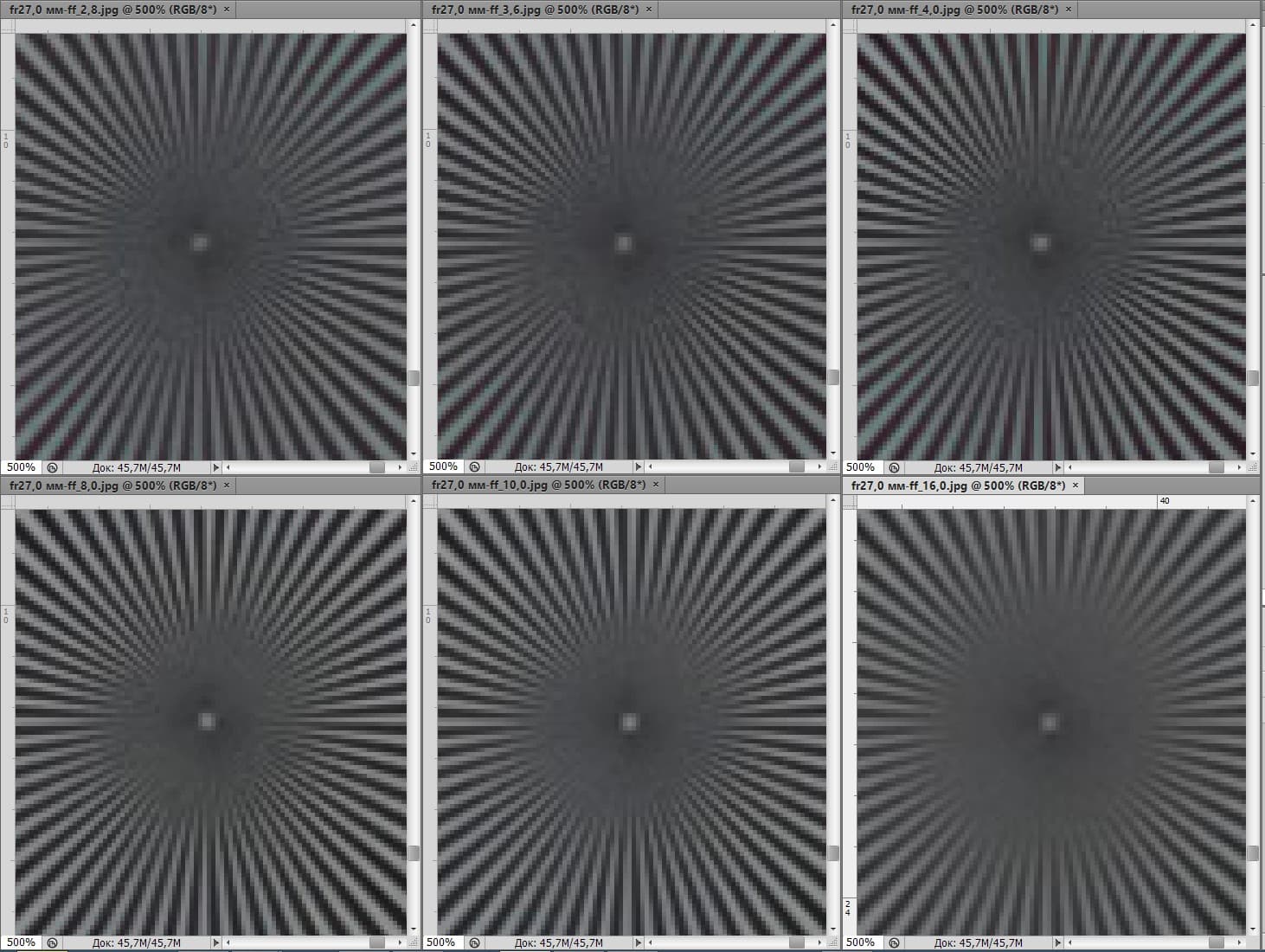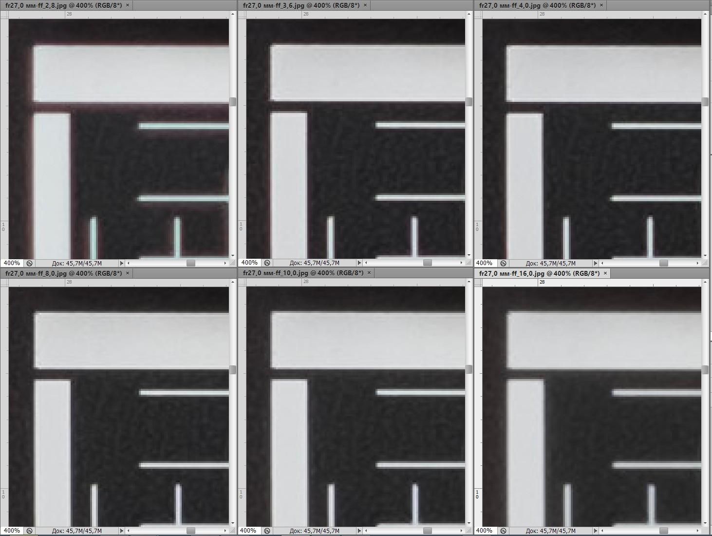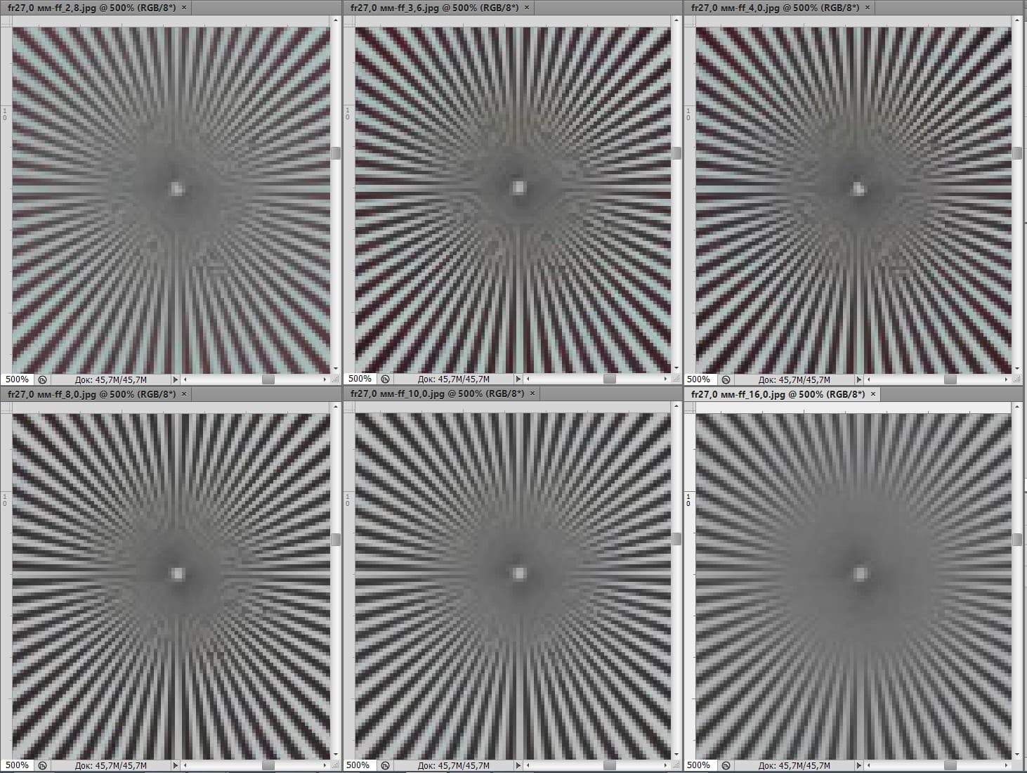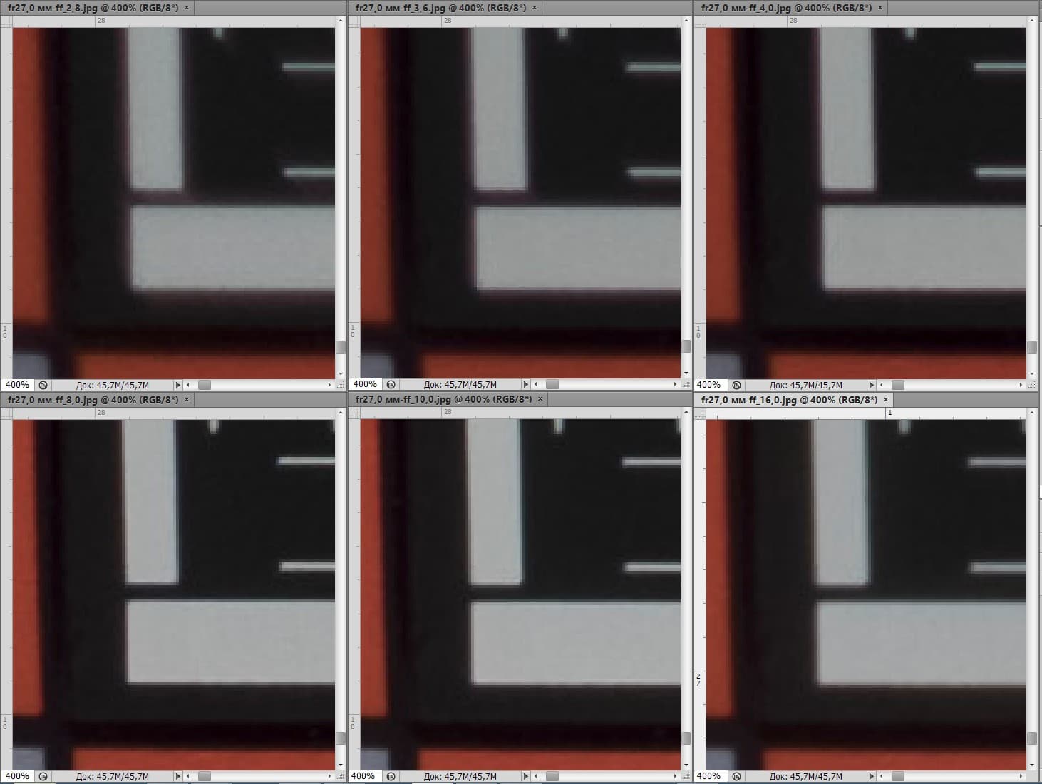 Объектив выгодно отличается весьма высокой разрешающей способностью в центре кадра и на периферии, причем начиная с максимального раскрытия и вплоть до F8. Любопытно, что с F3,5 до F8 на периферии она сохраняется на наиболее высоком уровне, а в центре кадра достигает максимума при F5,6. После F8 разрешение начинает снижаться, очевидно, уже из-за влияния дифракции.