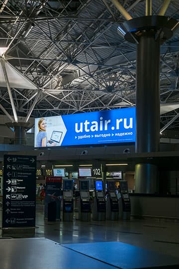 Сцена очень непростая для любой камеры и оптики: явная нехватка заполняющего света, несколько источников освещения с разной цветовой температурой, очень высокий контраст светящихся надписей, обилие деталей в густых тенях. Однако даже при полном раскрытии диафрагмы наш подопечный справился с балансом белого и показал отличную резкость и детализацию. Взглянем хотя бы на металлические балки под потолком и на детали электронных табло регистрации. Без труда читается некрупный текст в светах («Специальная информация по авиационной безопасности») и тенях («Навстречу новым возможностям»).