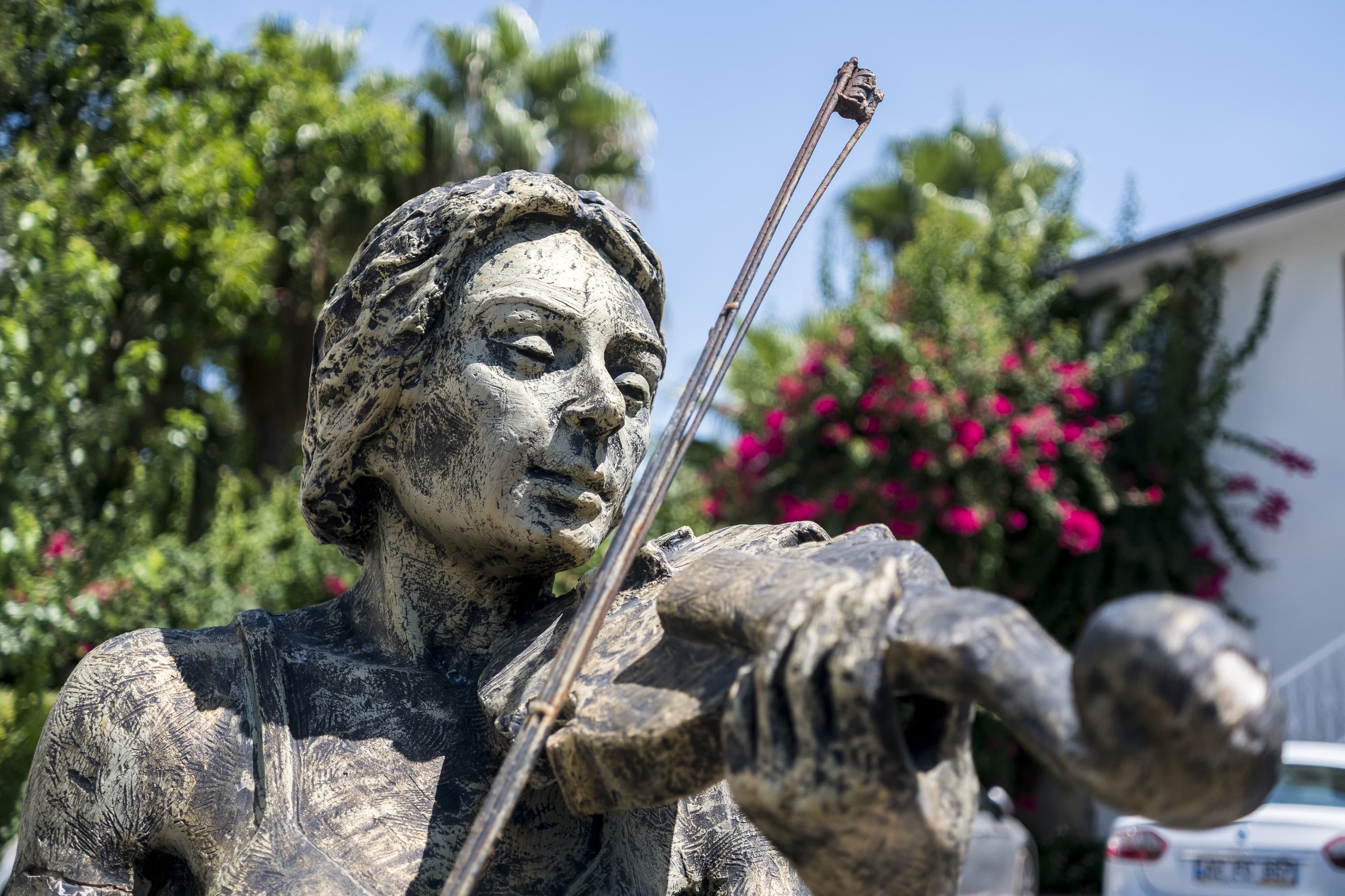 Объектив прекрасно справился с передачей фактуры поверхности материала скульптуры. Несмотря на яркое солнце, на полном раскрытии диафрагмы нам, кажется, удалось переместить в зону нерезкости всё незначащее и выделить лицо. Обратим внимание на то, что даже в области солнечного блика на лбу скульптуры Fujinon XF 27mm F2,8 сохранил детали.