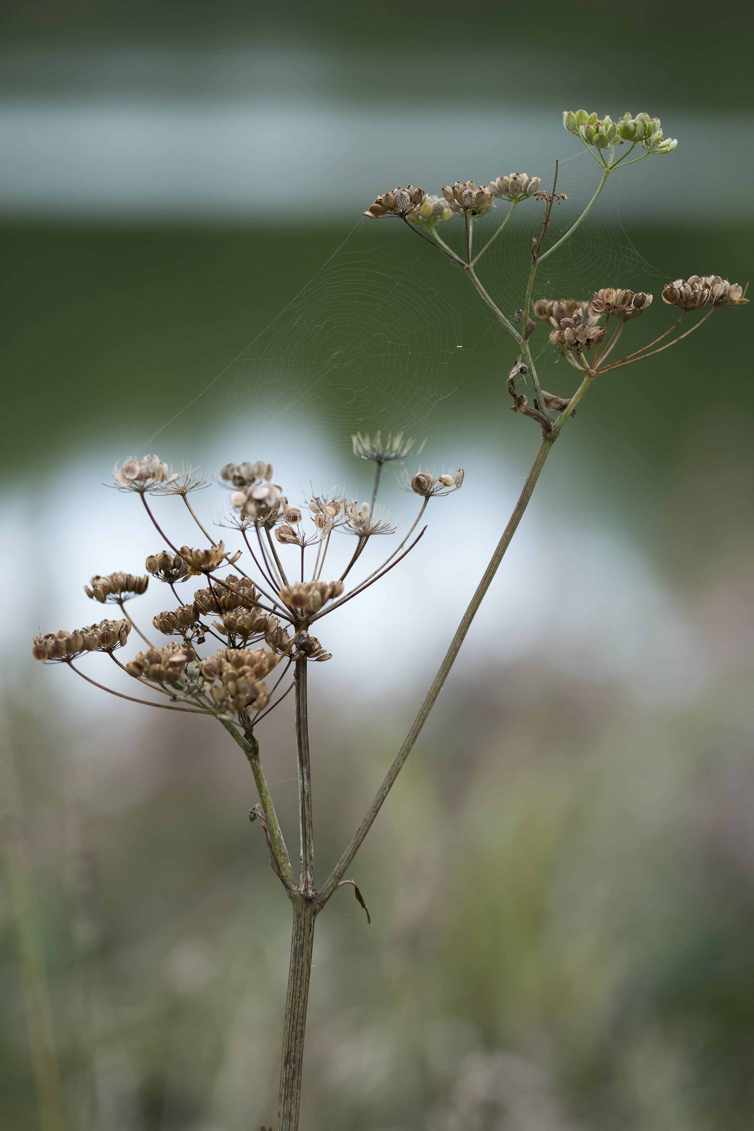 Оценим детализацию воспроизводимого изображения при съемке крупным планом (удаление от объекта около 1,5 м). Семена и волоски в зоне резкости выглядят практическим безупречно. Отлично видны белые нити двух паутин, нижней и верхней, на буром засохшем болиголове.
