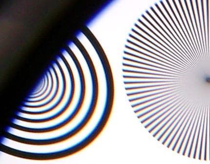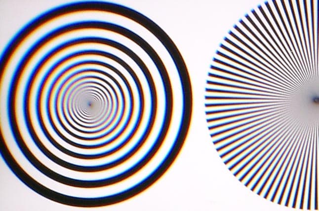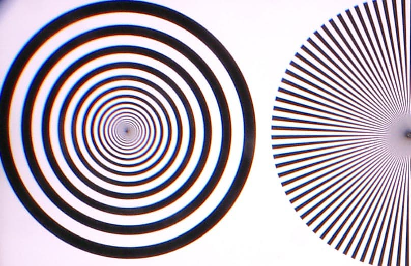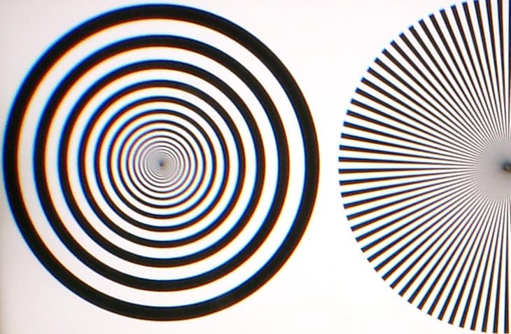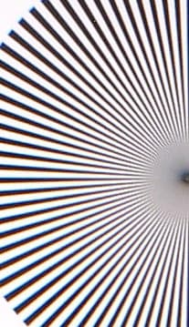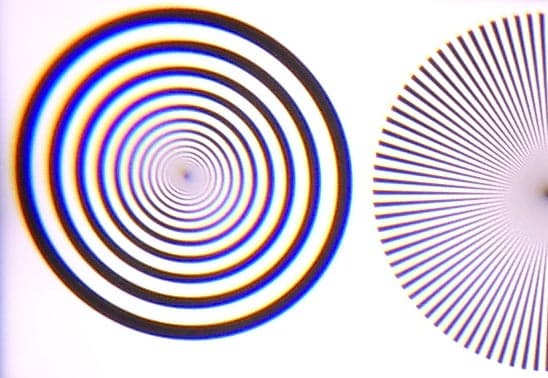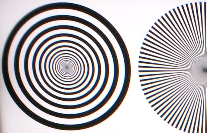 Координаты центра радиальной миры Xr=588, Yr=213, Rs=57. Rm=43. Наблюдается существенное виньетирование и заметные хроматические аберрации.