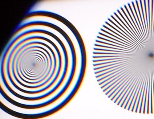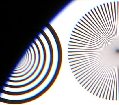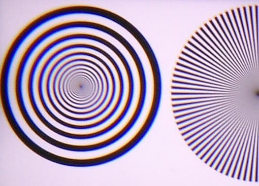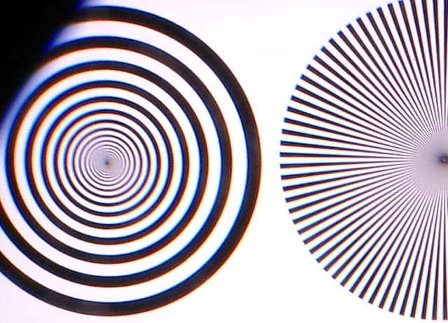 Для оценки качества производилась съемка камерой Casio QV 4000 радиальной и кольцевой мир, напечатанных на молочной пластиковой пленке Epson S041071, закрепленной на светостоле hama с цветовой температурой 8000 К. Яркости полос различались более, чем в 50 раз. Баланс белого устанавливался вручную. Фокусировка осуществлялась, когда мира располагалась в центре кадра, после чего камера поворачивалась таким образом, чтобы мира оказалась в углу кадра. Съемка проводилась при диафрагме f:8. Результаты съемки миры камерой без насадок можно посмотреть здесь. Снимки миры, расположенной по центру кадра, сделанные камерой с насадками и без насадок, почти не отличались, и в данной статье я анализирую только фотографии миры, расположенной вблизи от угла кадра. Радиус круга в пикселях, вне которого различимы все штрихи, обозначен буквой R. При наличии астигматизма круг вырождался в эллипс, в этом случае замерялись полуоси, лежащие в меридиональной (Rm) и в сагиттальной (Rs) плоскостях. Как видно из схемы, при фокусировке лучей, идущих в меридиональном сечении, кружок фокусировки превращается в линию, лежащую в сагиттальной плоскости, и, наоборот, при фокусировке лучей, идущих в сагиттальном сечении, кружок фокусировки превращается в линию, лежащую в меридиональной плоскости. Разрешение штрих на пиксель можно получить по следующей формуле: 180/6,28R. Черная и белая линии — два штриха.
