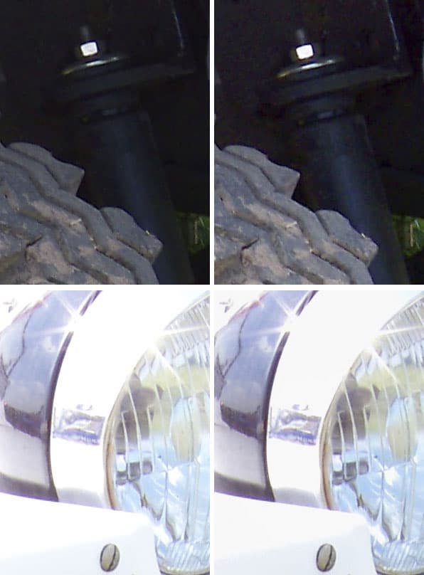 Таким образом, если сделать несколько снимков камерой 8 Мп Kodak EasyShare Z8612IS на выдержке 1/60 с для эквивалентного фокусного расстояния 60 мм и просмотреть их в масштабе 1:1, то среди них будет значительная доля смазанных. Стабилизатор же при такой выдержке должен обеспечить почти 100% качество. Далее приведены фрагменты в масштабе 1:1 для серии из пяти снимков, сделанных со стабилизацией (верхний ряд) и без стабилизации (нижний ряд) при указанных выдержке и фокусном расстоянии при съемке с рук. Не резкими в нижнем ряду можно считать два-три снимка. В верхнем резкие все. Если же фрагменты уменьшить вдвое (то есть привести к альбомному формату), то все фрагменты (и верхнего и нижнего рядов) будут казаться одинаково резкими.