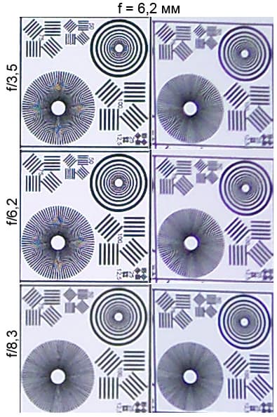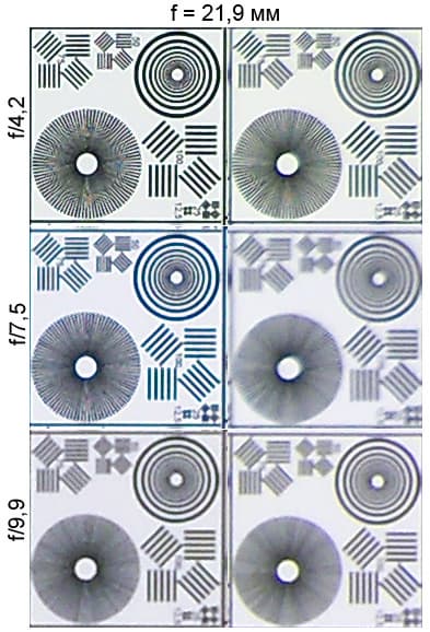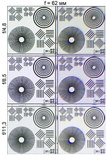 Далее приведены фрагменты снимков мишеней для разных значений фокусного расстояния и всех возможных диафрагмах. Масштаб 1:1, левая колонка - центр кадра, правая - правый верхний край кадра.