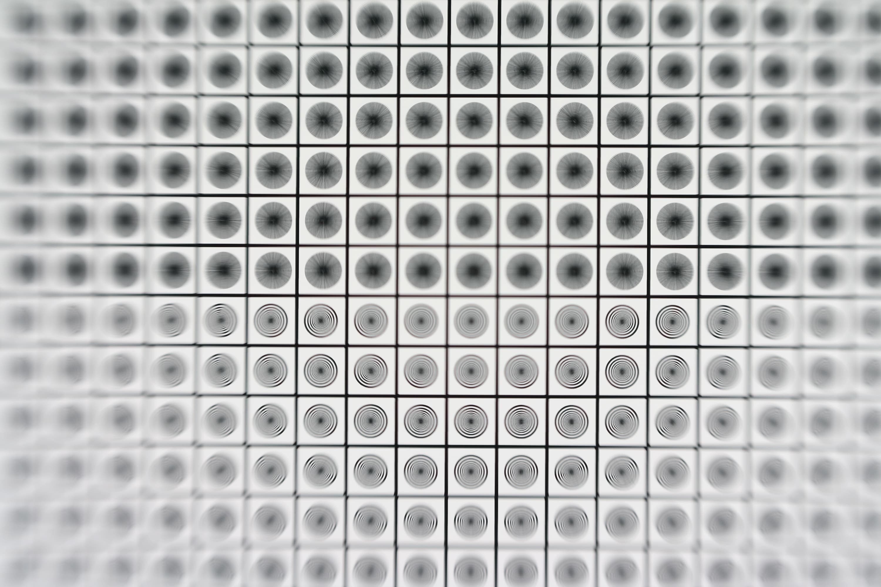Оценить оптические качества Lensbaby G3 можно по снимкам миры. Съемка производилась с дистанции 1 метр. В Lensbaby G3 была установлена диафрагма f/4 круговой формы. Положение оптического блока с помощью трех винтов перемещения было подобрано так, чтобы при повороте кольца фокусировки до середины возможного диапазона настроек, мира приблизительно попадала бы в фокус. Далее выполнялась серия снимков миры с изменением фокусировки от удаленного плана до ближнего (соответствует порядку снимков — сверху вниз). К сожалению, точно настроить Lensbaby так, чтобы оптическая ось объектива была перпендикулярна плоскости матрицы, невозможно, поэтому изображения немного несимметричны относительно геометрического центра кадра.