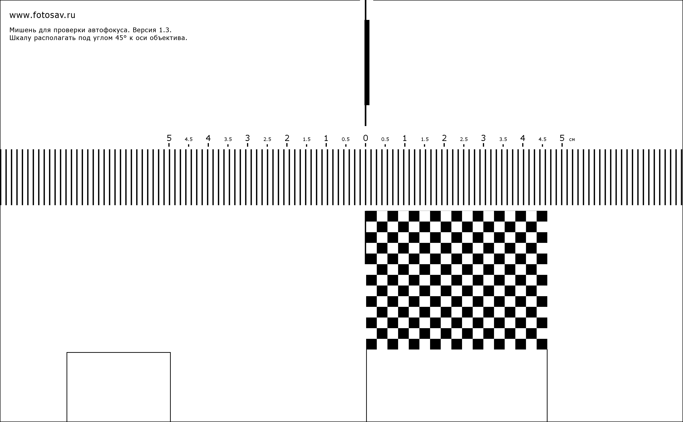 Для тестирования объектива на бэк-фокус используем специальную шкалу с мишенью. Ее несложно изготовить своими руками: распечатать на лазерном принтере, наклеить на плотный картон и сделать прорези для устойчивости. Скачать шкалу можно здесь (разрешение 300 dpi, размер 24×15 см).