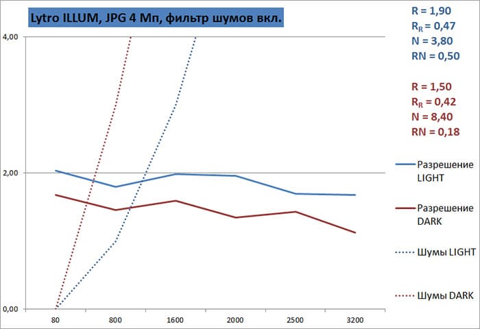 Что касается уровня шумов — он очень велик, пунктирные линии (графики шумов) резко уходят вверх. Но здесь надо пояснить один момент: в нашей методике уровень шумов рассчитан так, чтобы визуально он соответствовал падению разрешения. И он визуально соответствует, когда разрешение камеры составляет хотя бы 12 или 16 мегапикселей. Но 4-мегапиксельная Lytro Illum смотрится в нашей системе расчетов как совсем слабенькая. Уровень шумов велик, разрешение низкое, их отношение — тоже величина небольшая. Но именно такую оценку Lytro Illum получает как обычная фотокамера.