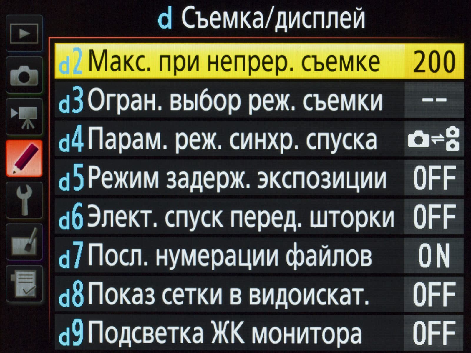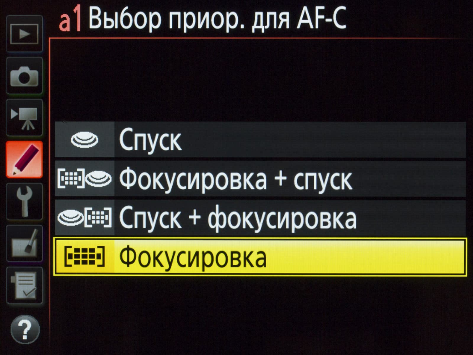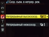 По умолчанию Nikon D5 устанавливает скорость медленной съемки 5 кадров в секунду. Максимальная скорость быстрой съемки — 14 fps, но с поднятым зеркалом (то есть со «слепым» видоискателем и автофокусом). Поэтому мы выбрали максимальную скорость быстрой съемки 12 fps — на этой скорости Nikon D5 может полноценно отслеживать перемещения объекта съемки.