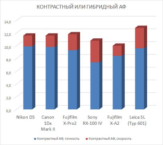 Еще одна диаграмма позволит сравнить возможности контрастного (гибридного) АФ флагманов Nikon, Canon и некоторых беззеркалок, для полноты картины. Как видите, здесь рекордсменом стала Leica SL — камера чуть менее точная, чем флагманы Nikon и Canon, но заметно более быстрая. По совокупности точности и скорости она пока держит первое место среди всех камер, побывавших в нашей лаборатории. А пример Sony RX-100 IV весьма показателен: эта камера «строчит», как пулемет, но ее АФ крайне неточен.