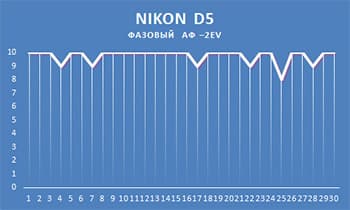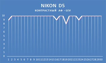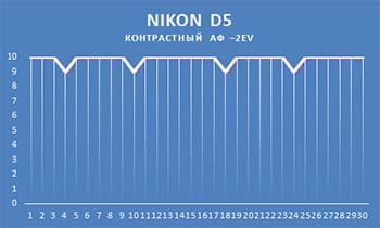 Контрастный автофокус, разумеется, обладает такой же высокой точностью (выше некуда), но гораздо менее высокой скоростью. При освещенности −1EV тест прошел за 57,1 секунды (у флагмана Canon — 51,8 секунды), при освещенности −2EV — за 60 секунд (у флагмана Canon — 57,8 секунды). Здесь мы видим существенную разницу во времени, так можем сказать, что контрастный АФ Nikon D5 работает чуть медленнее, чем гибридный АФ Canon EOS-1D X Mark II. Немного, но уступает по скорости.