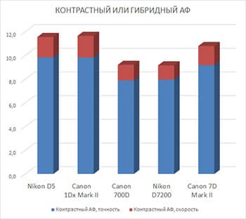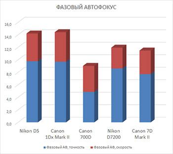 | Тип АФ, параметр | Nikon D5 | Canon EOS-1D X Mark II | Canon 700D | Nikon D7200 | Canon EOS 7D Mark II |