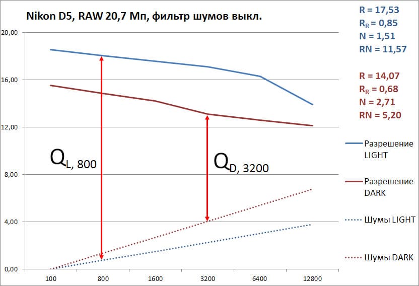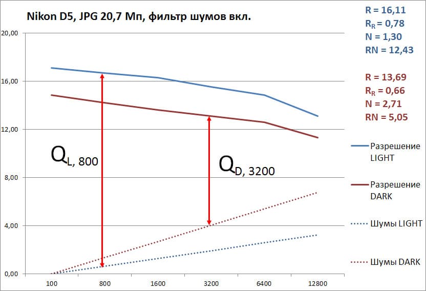 И в конце этого теста мы даем сравнительную таблицу «Уровень шумов». Здесь собраны результаты четырех полнокадровых камер — трех зеркалок и одной очень крутой (дорогой) беззеркалки. Эта таблица подводит итог: в конце концов, падение разрешения не так сильно сказывается на качестве картинки, как уровень шума. И здесь герой нашего теста — флагман Nikon D5 — показал довольно высокие, но не выдающиеся результаты. Если преимущество Canon EOS-1D X Mark II над всеми другими камерами в таблице видно (очевидно), то про качество Nikon D5 можно сказать, что камера работает на уровне ниже флагмана Canon, но выше таких фотокамер, как Leica SL и Nikon D750. Разумеется, здесь мы учитываем только уровень шумов. Разрешение Nikon D5 находится на достойной высоте, измерение динамического диапазона мы пока не включили в тестовую программу, а остальным параметрам качества сложно дать количественную оценку.