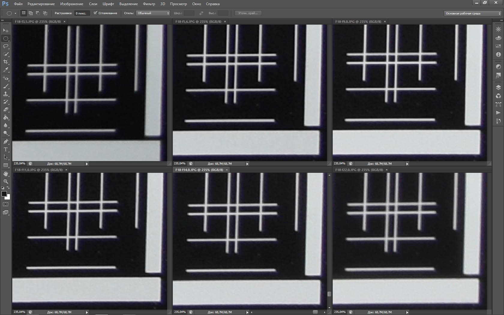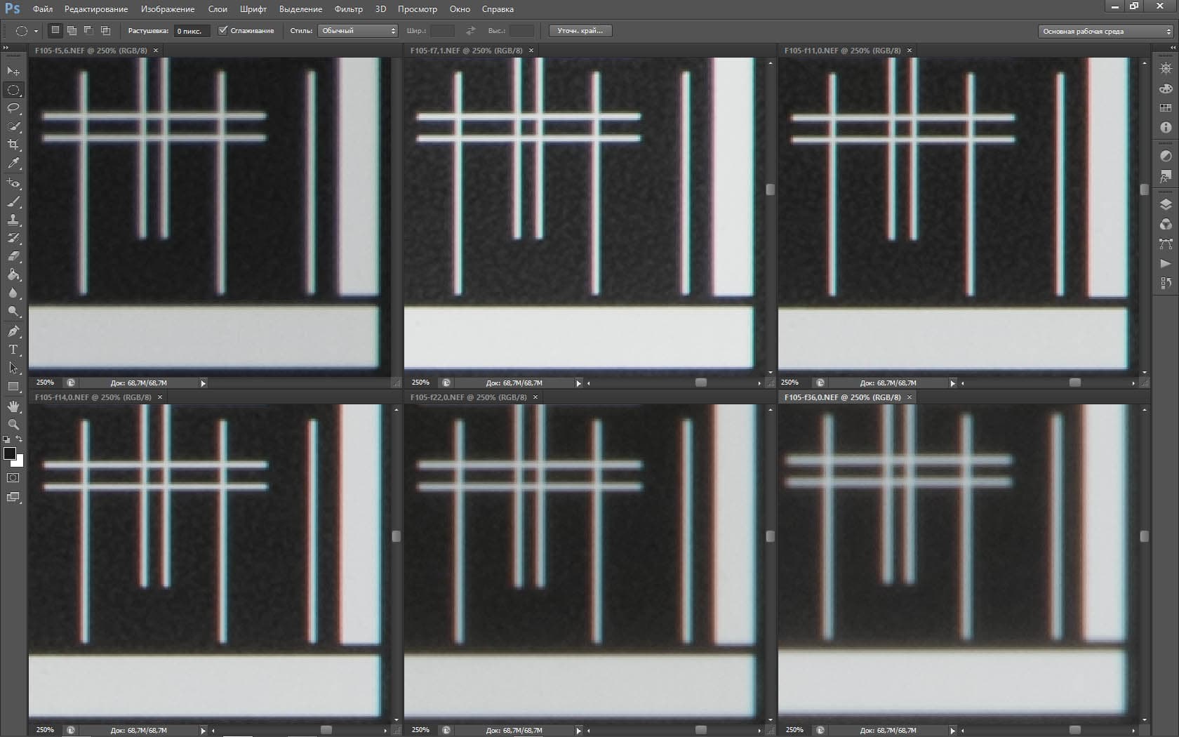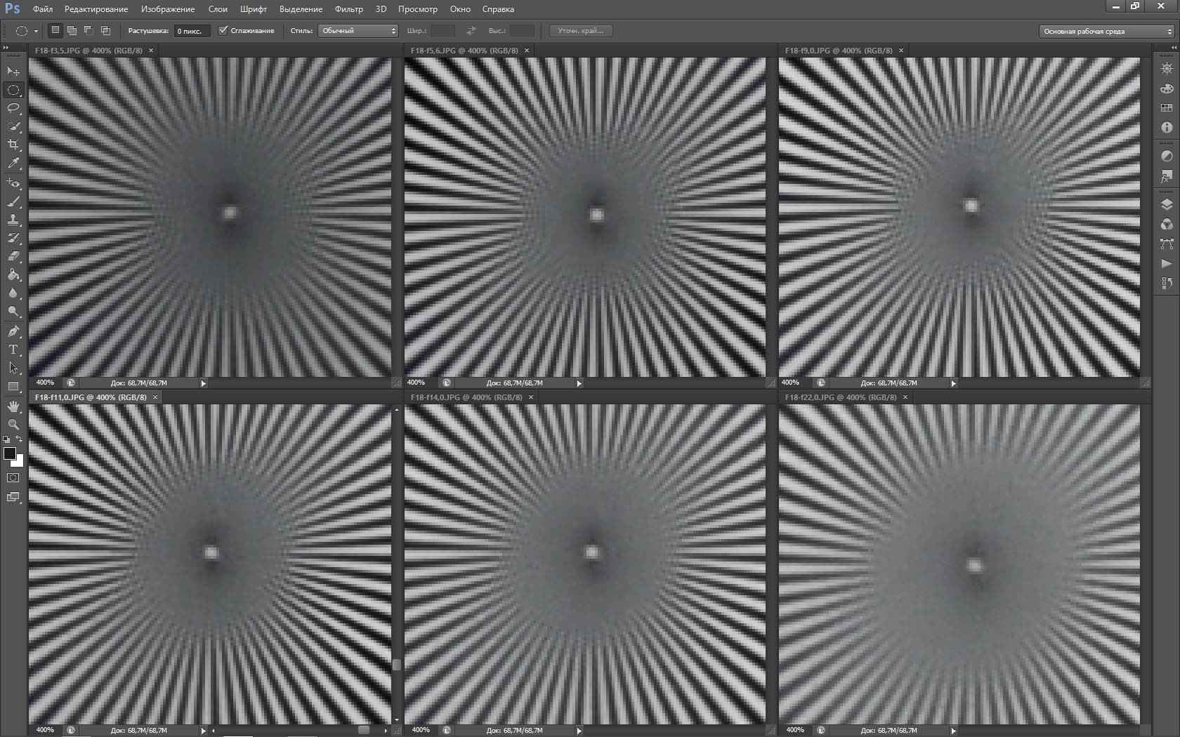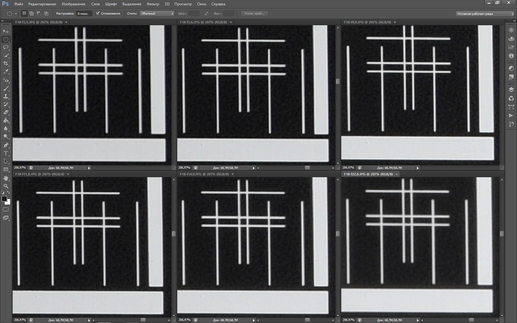| На всех скриншотах: верхний ряд: f/5,3 — f/8 — f/13, нижний ряд: f/16 — f/25 — f/36 | |||