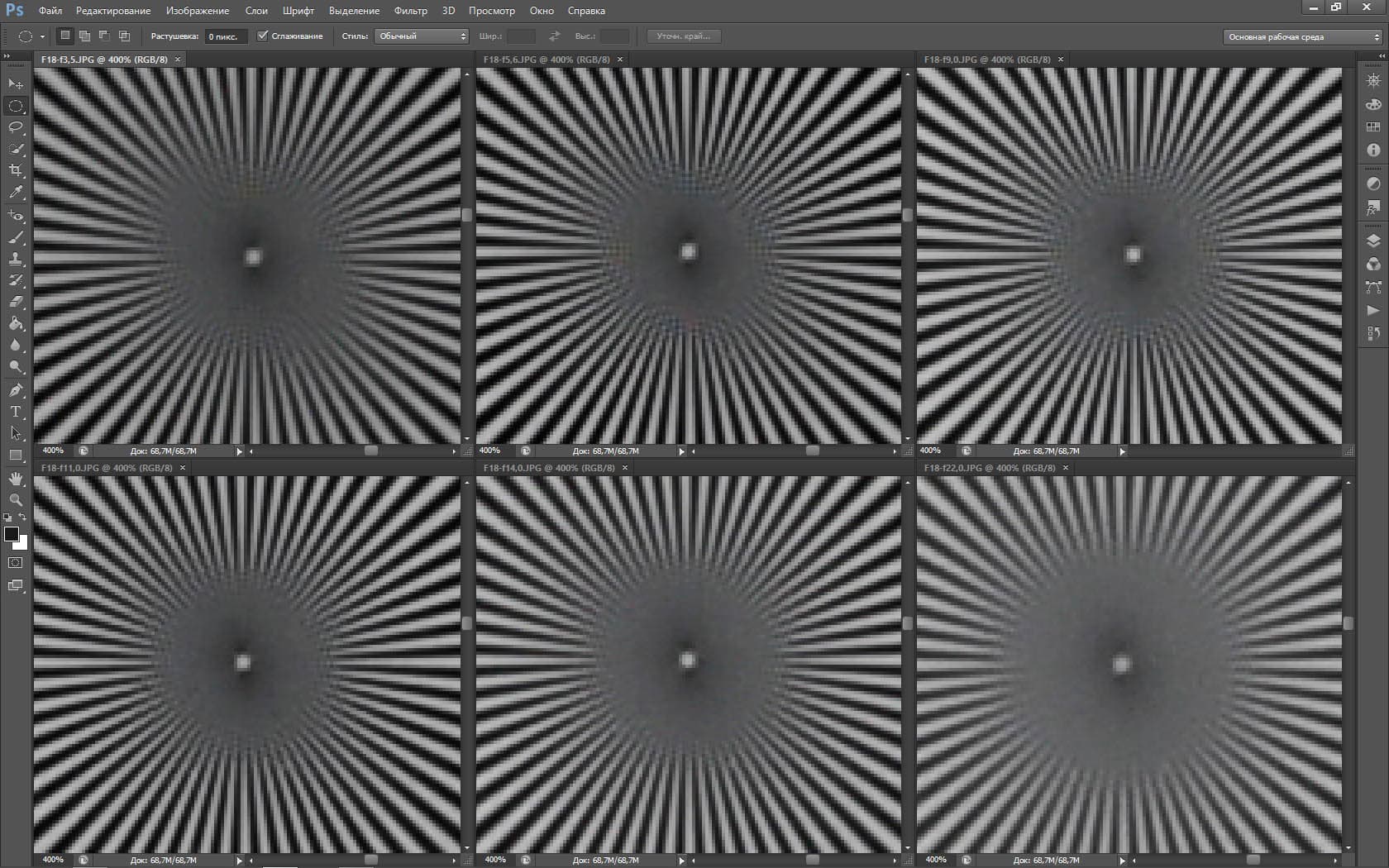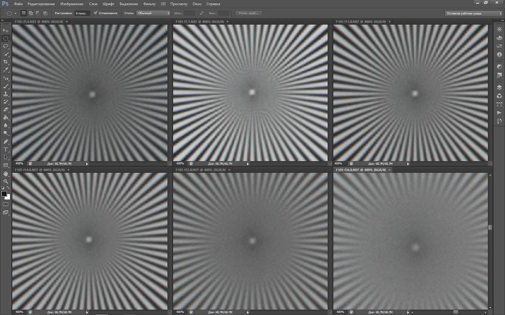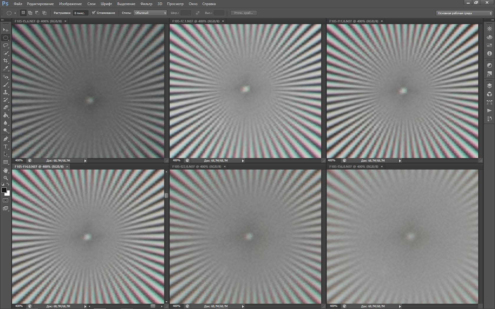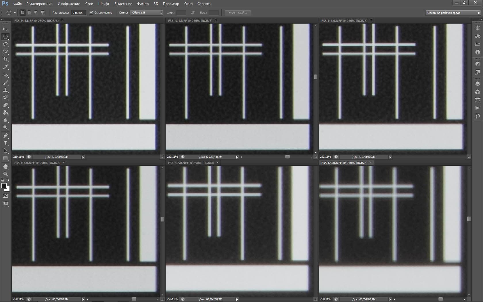 | На всех скриншотах: верхний ряд: f/5,3 — f/8 — f/13, нижний ряд: f/16 — f/25 — f/36 | |||