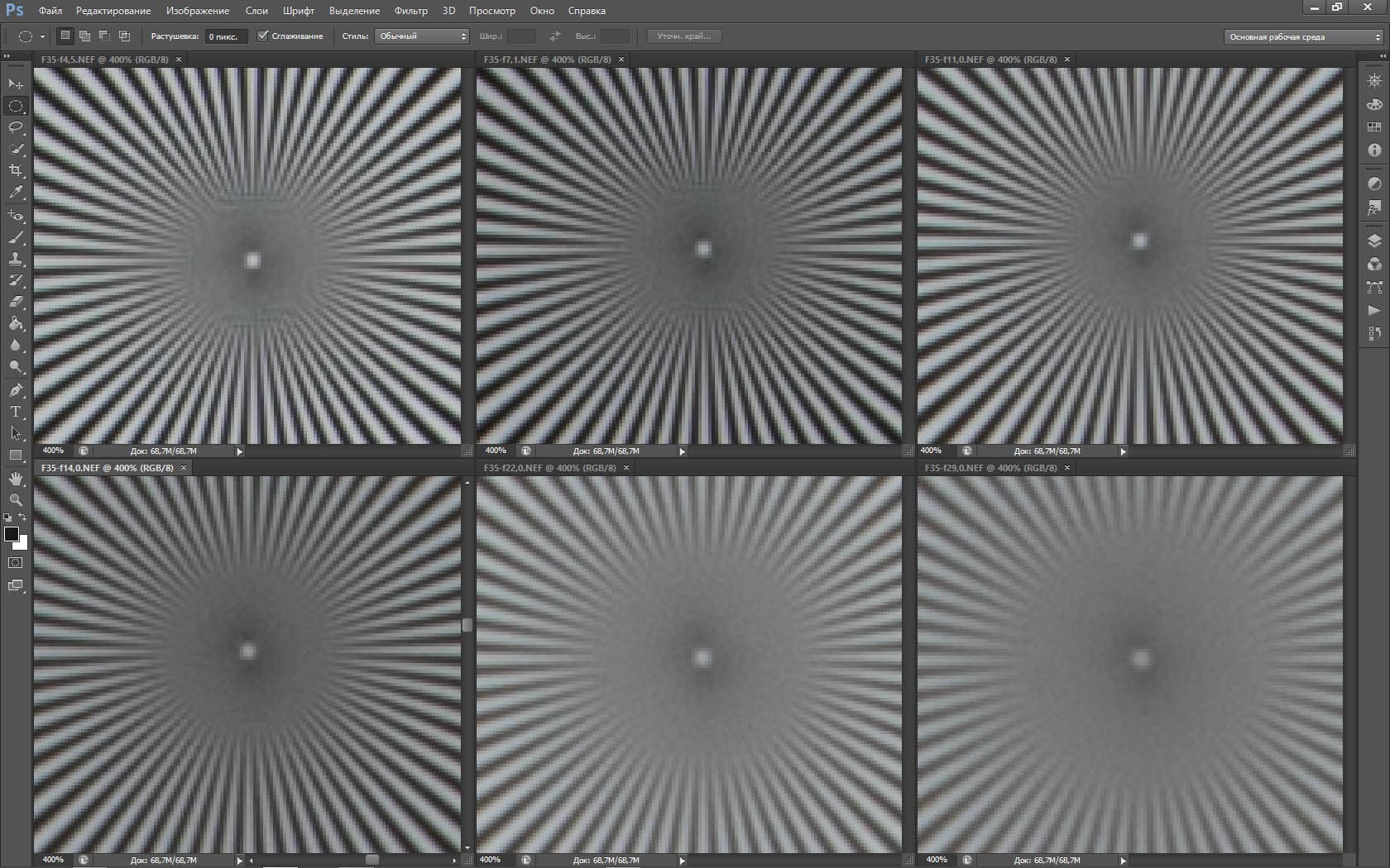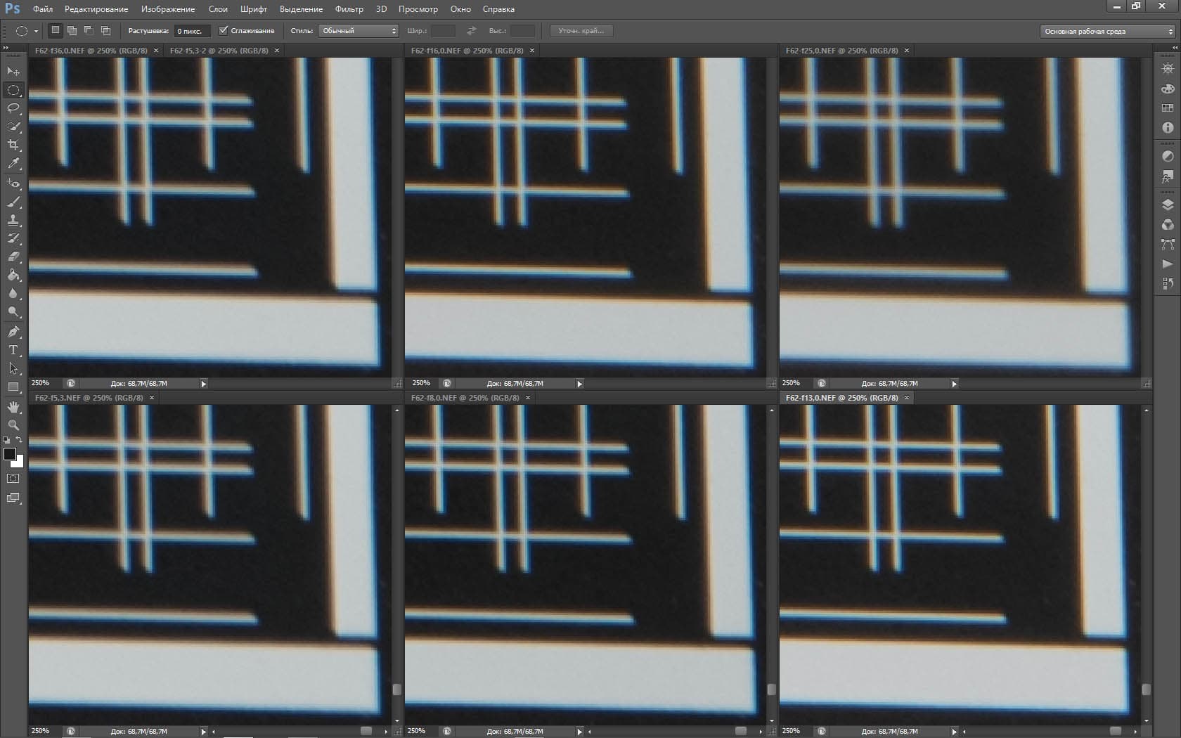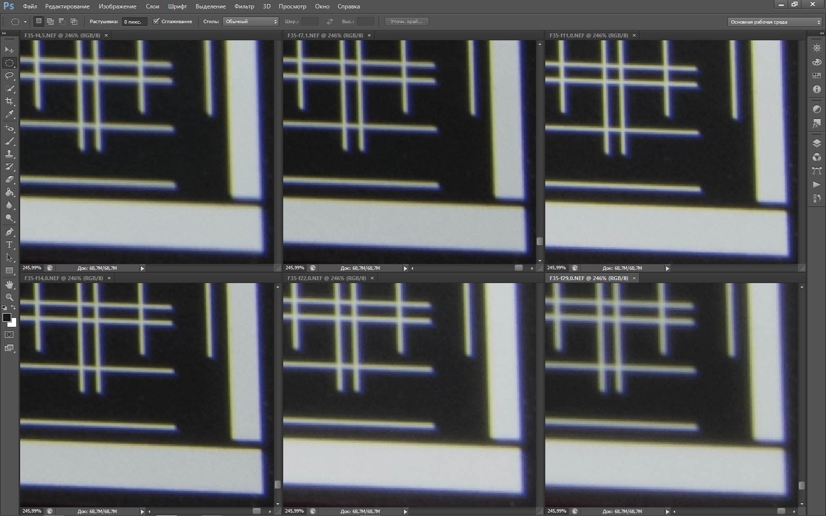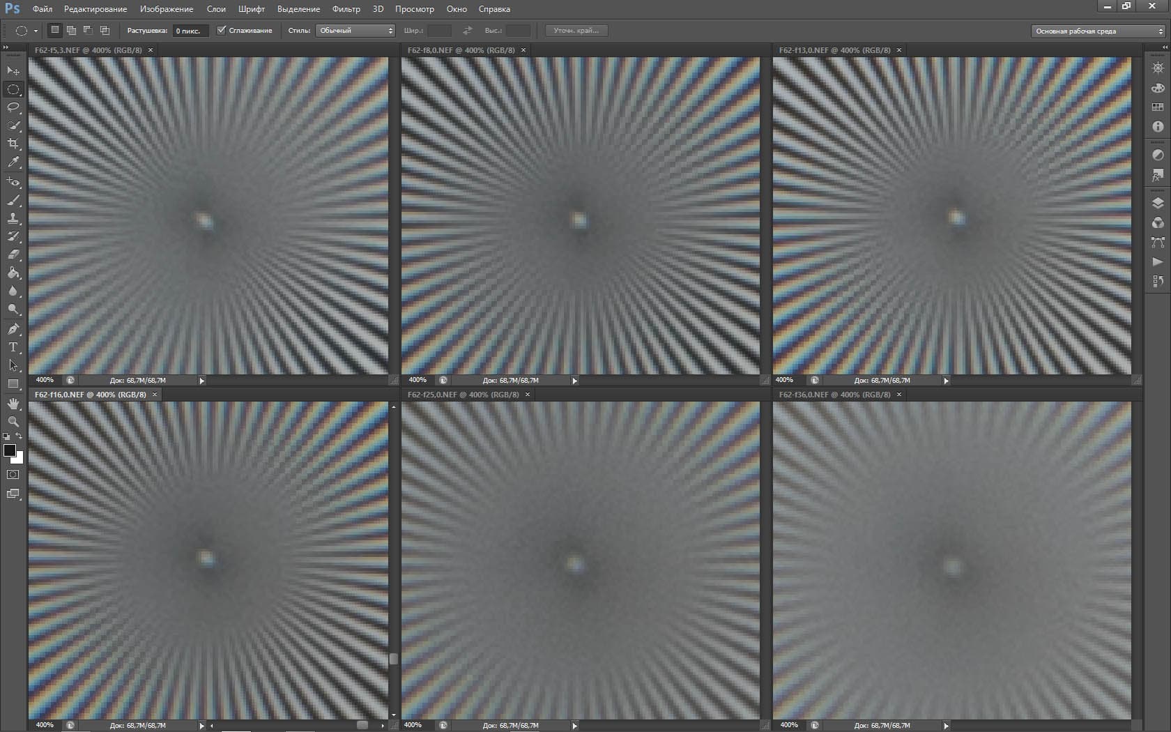 | На всех скриншотах: верхний ряд: f/5,3 — f/8 — f/13, нижний ряд: f/16 — f/25 — f/36 | |||