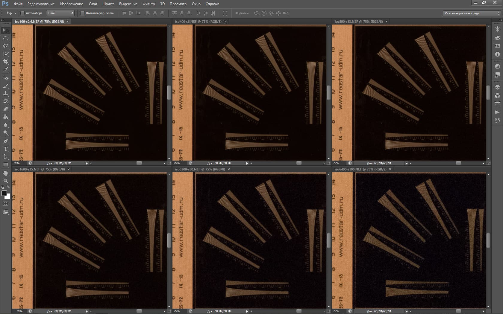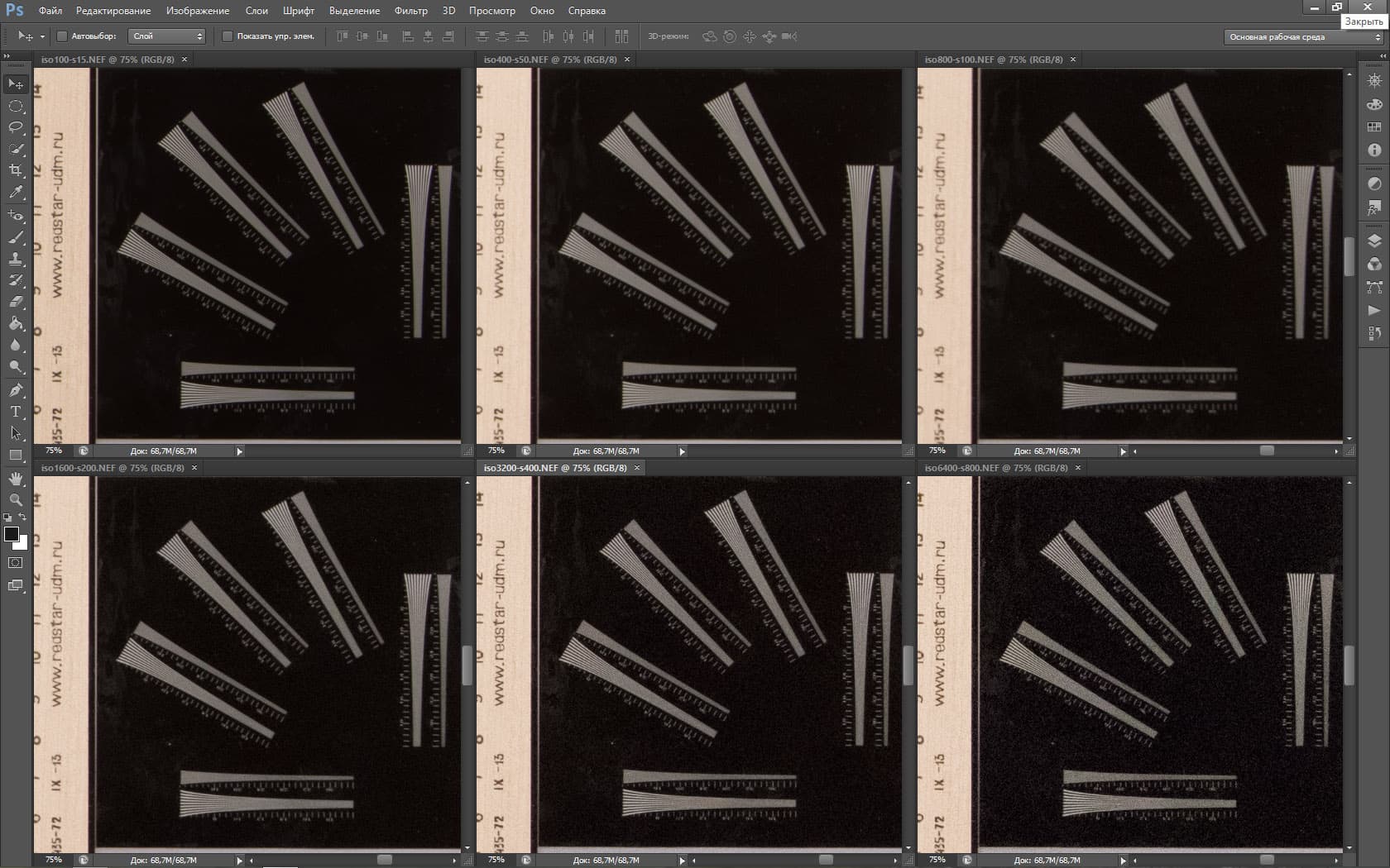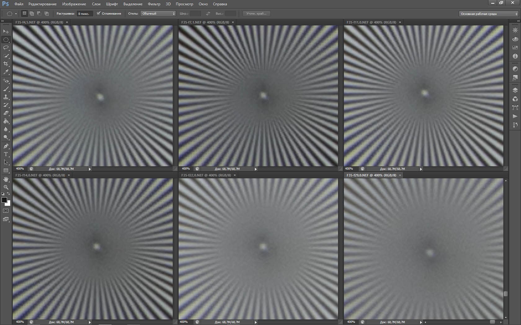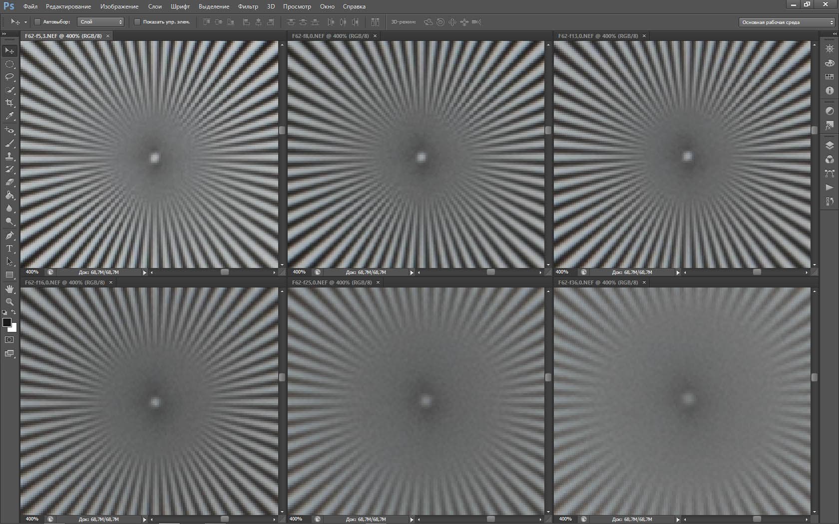 | На всех скриншотах: верхний ряд: f/5,3 — f/8 — f/13, нижний ряд: f/16 — f/25 — f/36 | |||