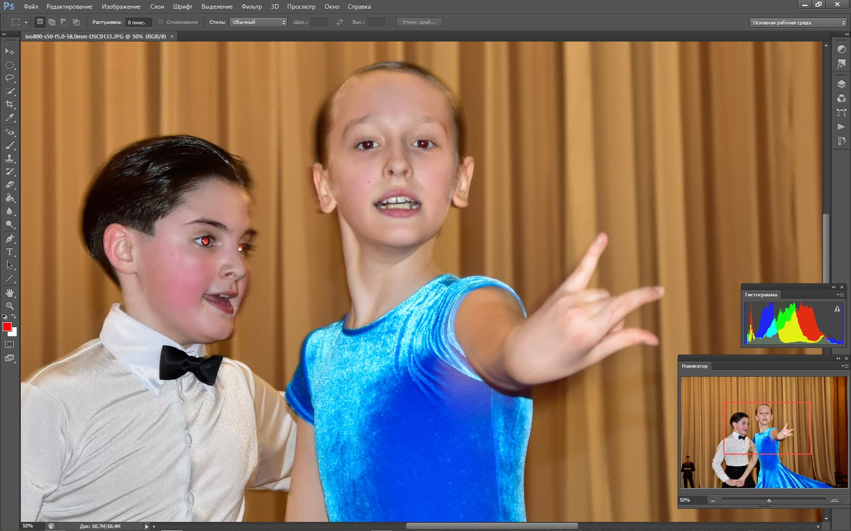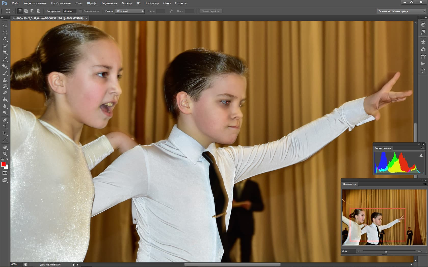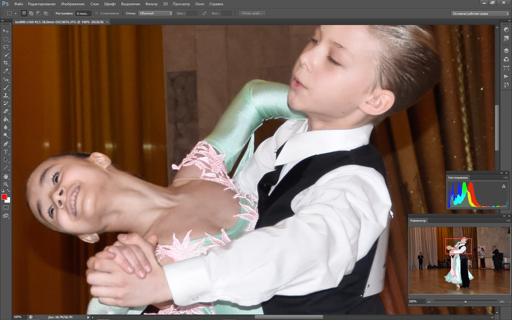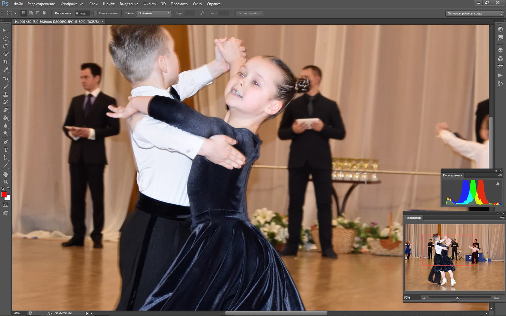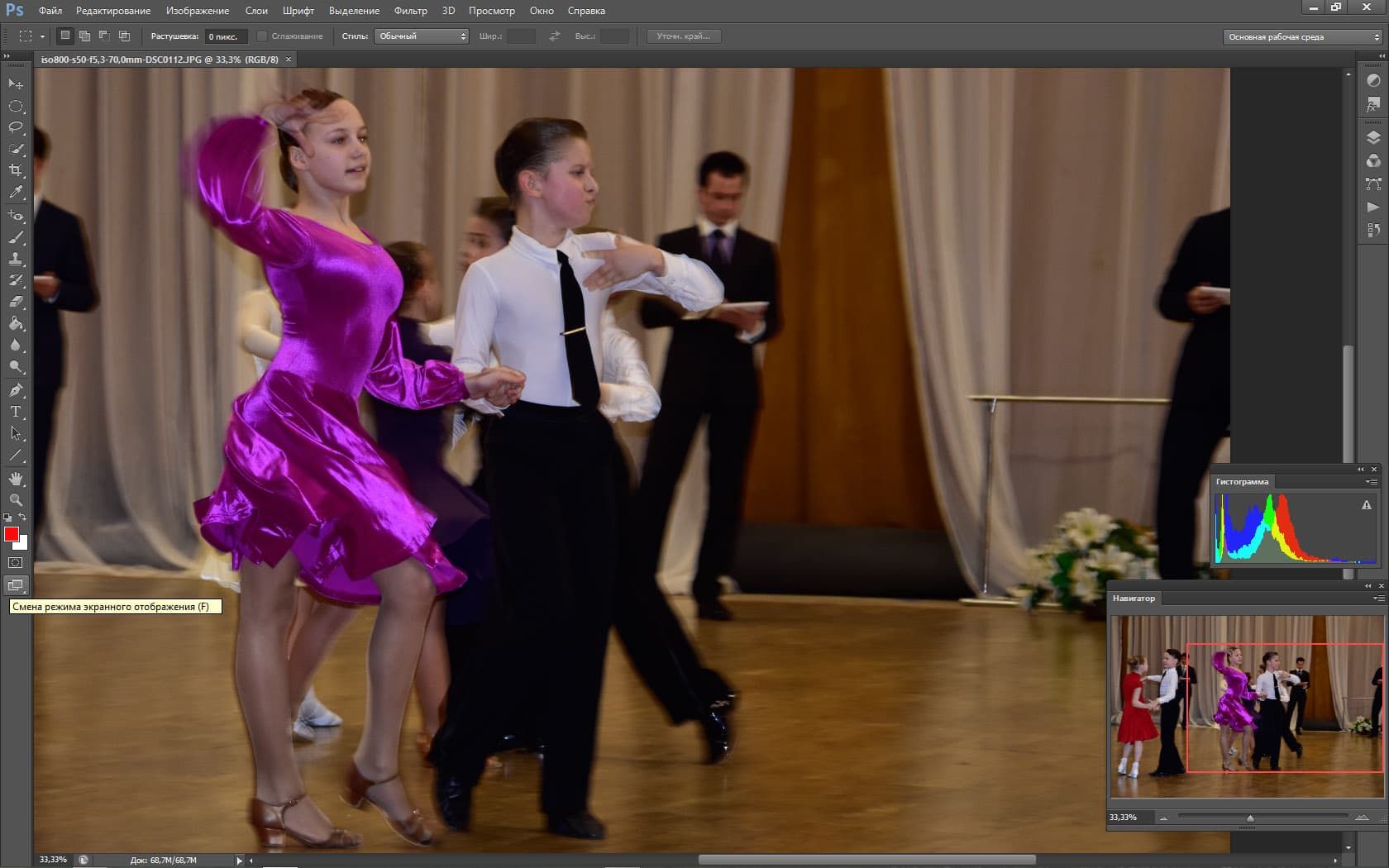 Периодически перед камерой мелькают посторонние объекты (первый раз в жизни был благодарен людям, которые «прут» перед объективом). Эти объекты на долю секунды сбивают фокус и экспозицию, но Nikon D5500 очень быстро восстанавливает картинку. Видно, как автофокус мечется в поисках главного объекта, как он быстро перестраивается и старается вести именно главный объект. Но задачка для автоматики поставлена нерешаемая, если вы хотите «вести» какую-то одну пару на соревнованиях по бальным танцам, вас спасет только ручной фокус.