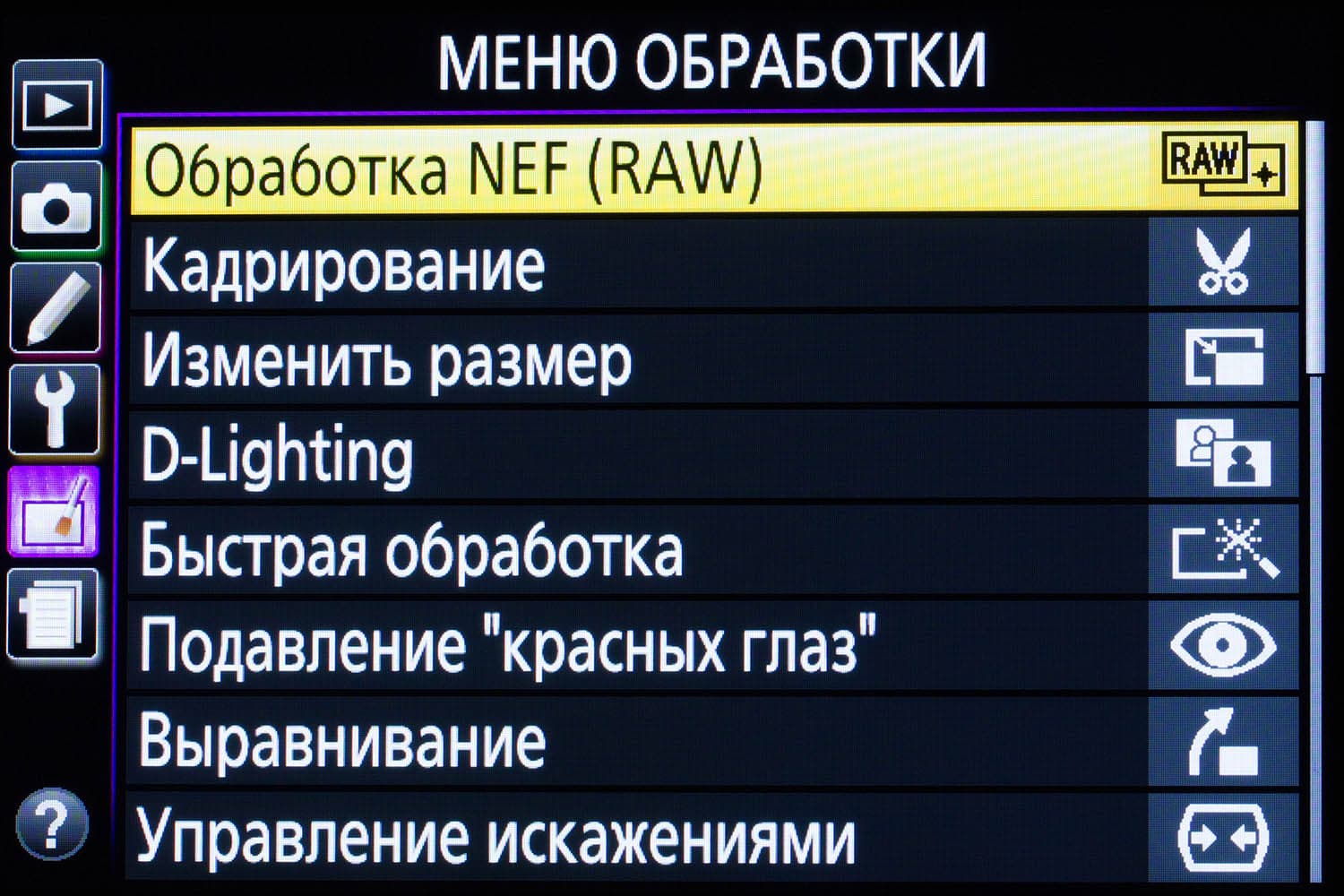 При всем желании хоть к чему-нибудь придраться, это очень сложно сделать. Никоновский дизайн остался безупречным, новые элементы прекрасно вписались в классику. Работать с камерой очень удобно. Она прекрасно лежит и в крупной, и в детской руке. Проверено. Давайте посмотрим, появились ли какие-нибудь новые элементы в меню камеры?