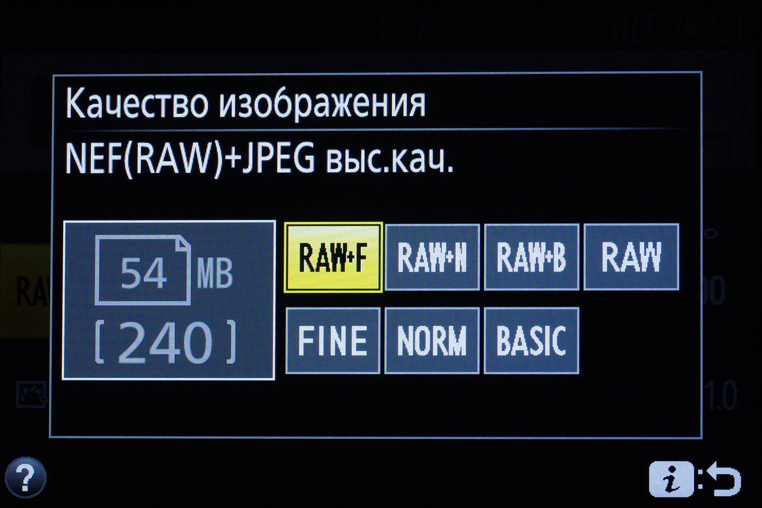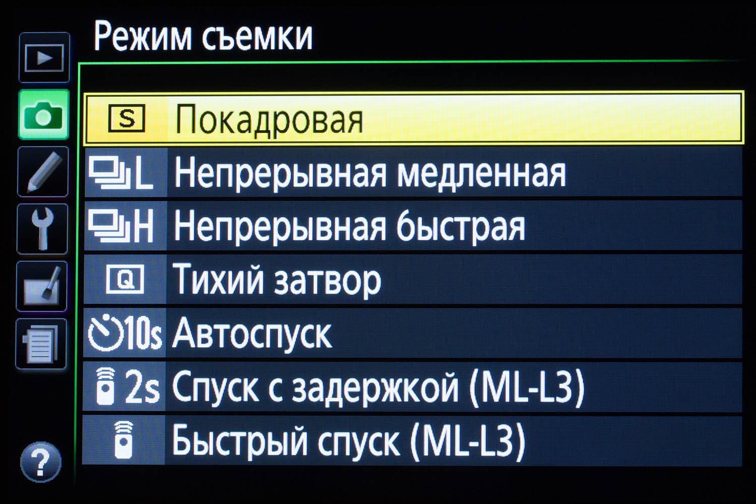 | L — непрерывная медленная съемка | JPG | RAW | RAW + JPG |
