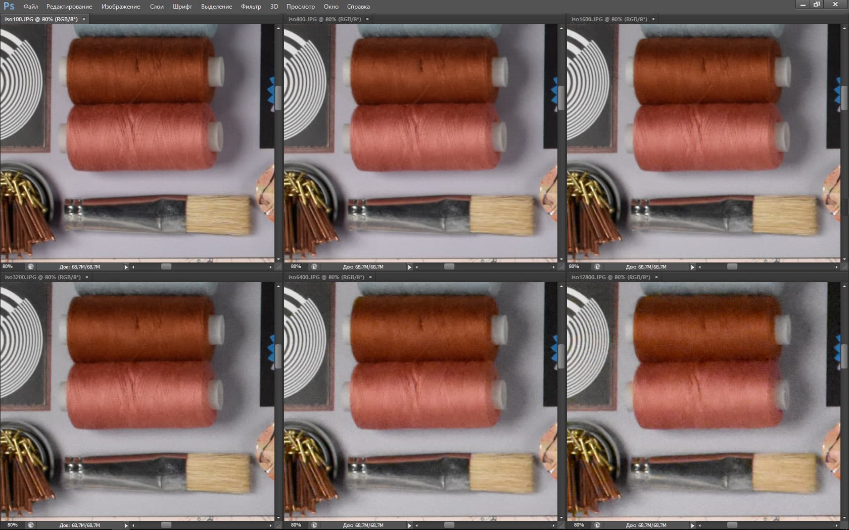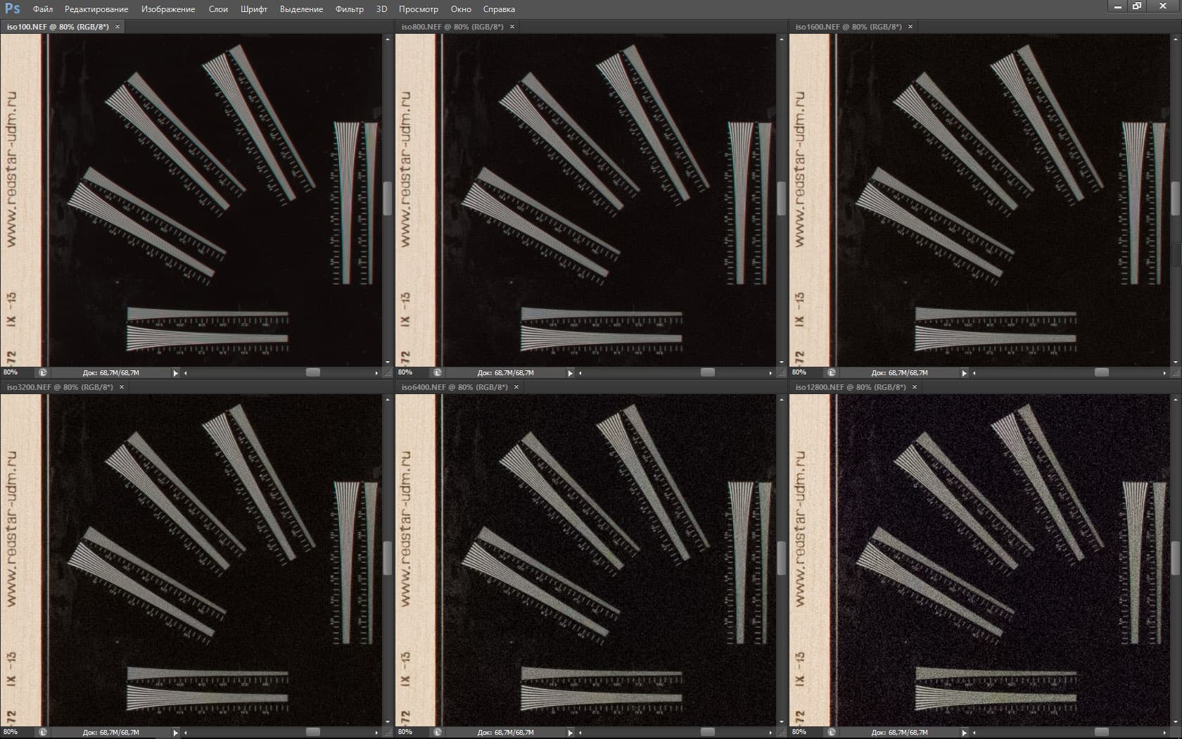 Эти различия видны даже на ISO 800, а по мере увеличения чувствительности становятся все более заметными. Мы явно видим, что Nikon D7200 «шумит» меньше. То есть, как нам показали кадры RAW, «шумит» она так же, но борется с шумами более успешно. Правда, уже на чувствительности ISO 3200 мы наблюдаем желтую полоску вдоль горизонтальной черной полосы. На снимке ISO 6400 полоска становится еще более отчетливой, а на ISO 12 800 в кадре появляются желтые пятна. У D7100 желтых пятен нет, но уровень шумов — более высокий.