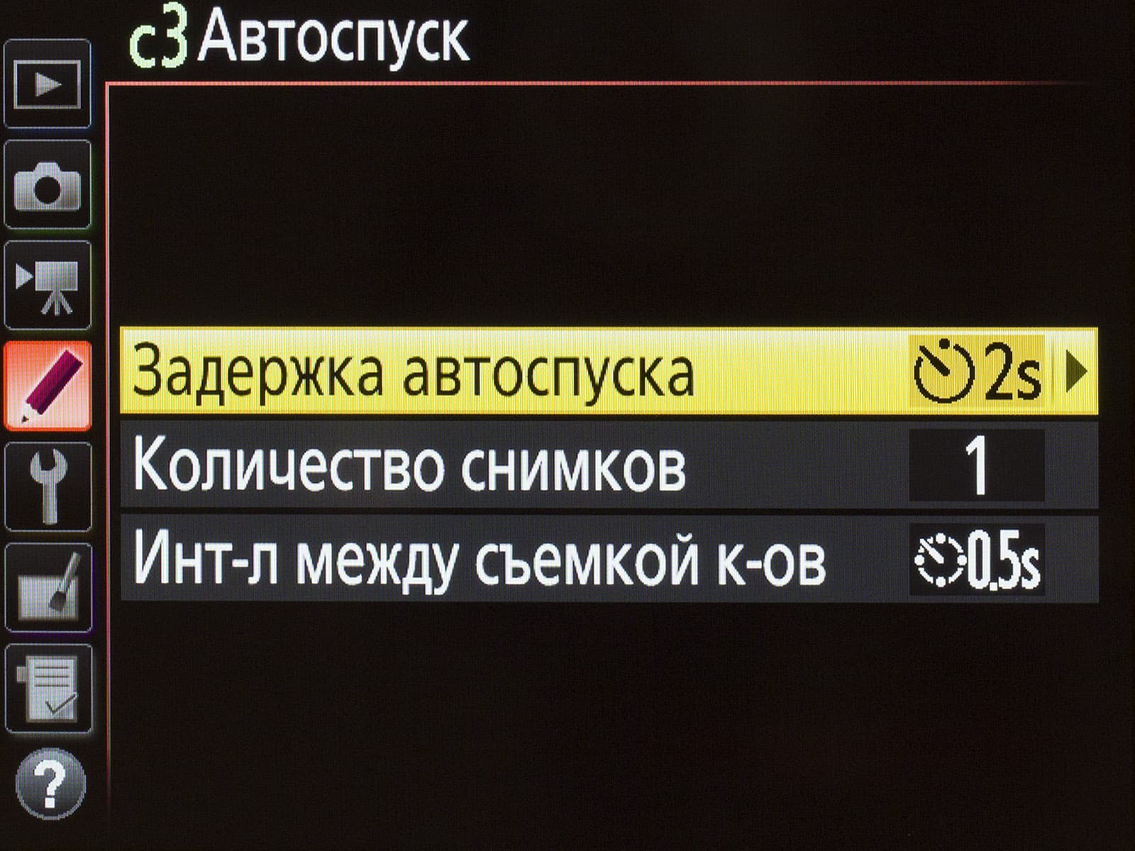 | Автоспуск | 2, 5, 10, 20 секунд; от 1 до 9 экспозиций с интервалами 0,5, 1, 2 или 3 секунды |