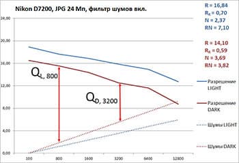 Напомню, что все эти оценки — средние в диапазоне ISO 100 — 6400. И получены они в светлой сцене по тестовым снимкам «JPG с включенным фильтром шумов». Впрочем, если мы перейдем к темной сцене, преимущество D7200 сохранится: