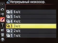 | Low — низкая скорость 6 fps до заполнения буфера | 5,87 fps / ∞ | 4,8 fps / 7 кадров (13 кадров у D7200) | 4,9 fps / 5 кадров (10 кадров у D7200) |