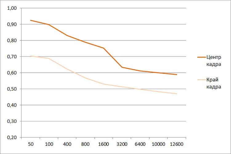 Разрешение на среднем фокусе 34 мм немного «скачет», но в целом остается высоким — в диапазоне 0,65—0,85 линии на пиксель. Бросающейся в глаза разницы между показателями RAW и JPG здесь нет, а край кадра по разрешению периодически обгоняет центр. В целом картина весьма достойная и похожа на работу высококлассного объектива.