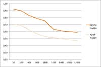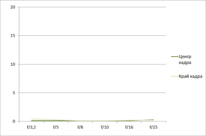 На этом фоне узкая диафрагма f/22 дает лучший результат — порядка 0,6 линии на пиксель. А край кадра во всем диапазоне отстает от центра примерно на 0,1 (это обычная картина для большинства объективов).