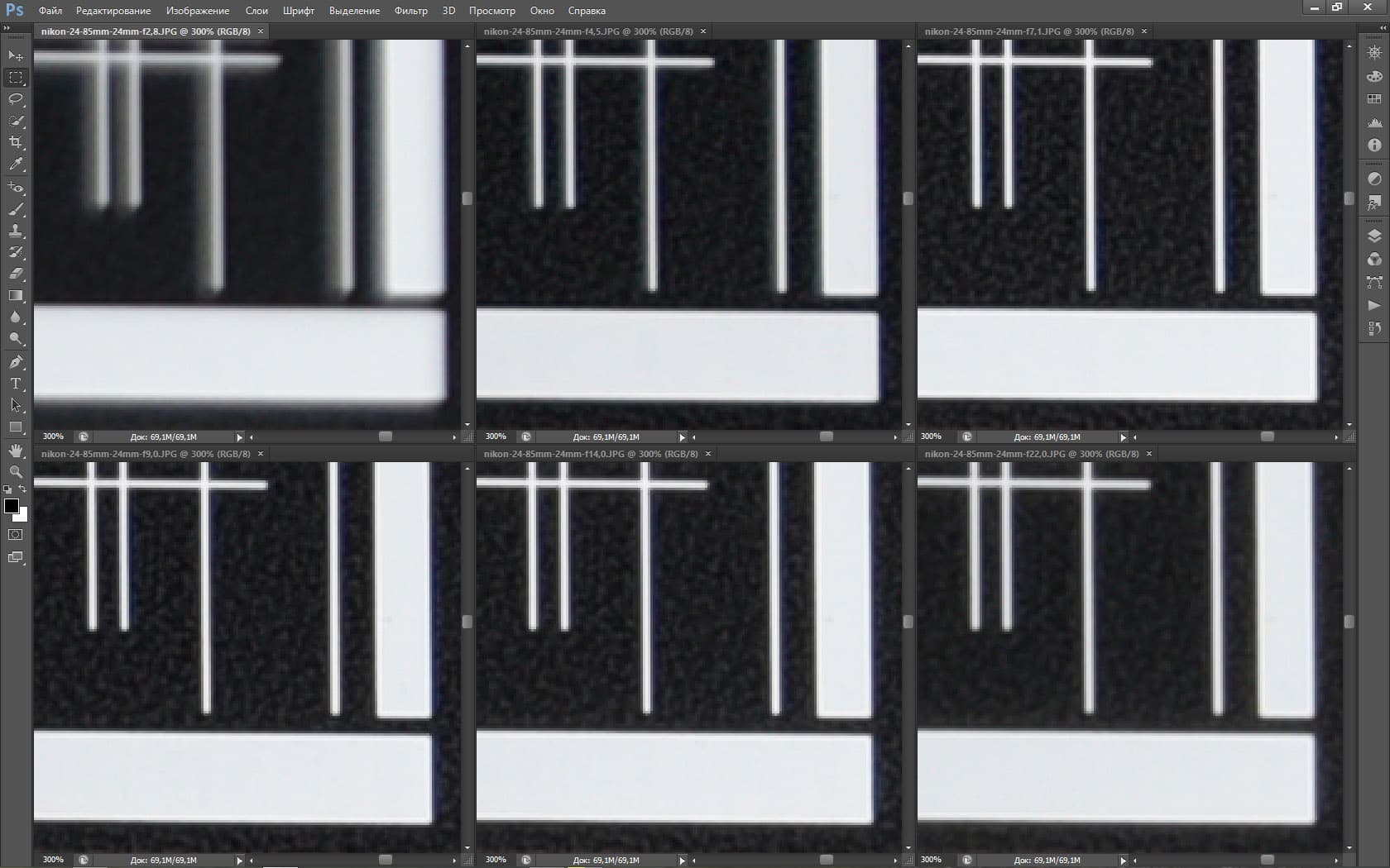 | Nikon 24-85mm f/2.8-4D IF AF Zoom-Nikkor ЭФР = ФР = 62 мм уровень хроматических аберраций на разных диафрагмах | |