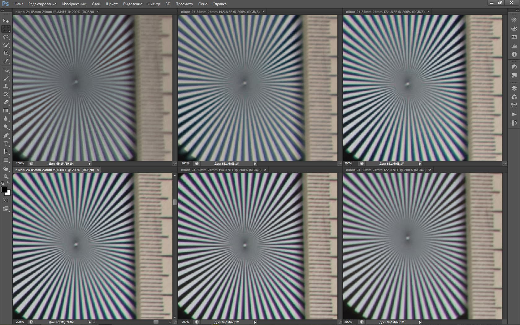 На «коротком» фокусе Nikon 24-85mm f/2.8-4D показывает неплохое разрешение в центре кадра — на средних диафрагмах это порядка 0,75 линии на пиксель по показаниям радиальных мир в JPG и порядка 0,8 в RAW. Но на широкой диафрагме f/2,8 разрешение падает до 0,55 линии на пиксель (это к вопросу о том, что высокая светосила у некоторых объективов реально не работает, поскольку открытая диафрагма сильно замыливает картинку).