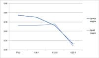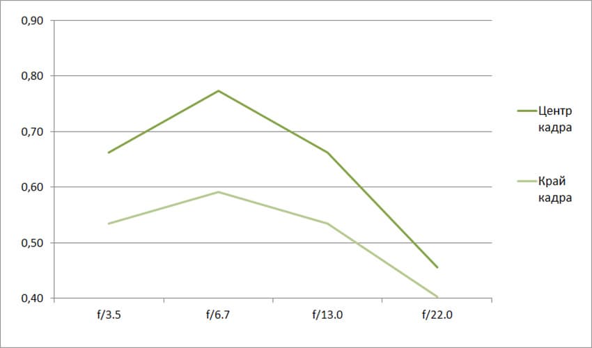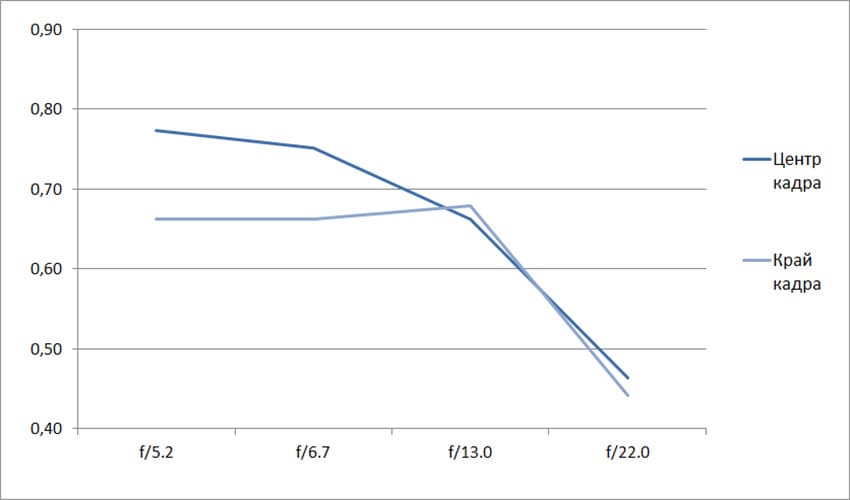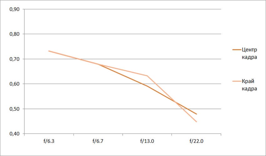 На среднем «фокусе» картина чуть лучше: в диапазоне f/5,2 — f/13 разрешение не опускается ниже 0,6 линий на пиксель. Здесь тоже наблюдается более низкое разрешение на периферии кадра, но потом, в диапазоне f/13 — f/22, край кадра и центр сравниваются, и разрешение снижается по мере закрытия диафрагмы до 0,45.