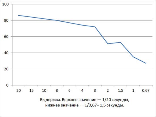 Стабилизатор Olympus E-M1 показал более высокий результат — пороговое значение находится на уровне 1/3 секунды. Т. е. крутой 5-осевой стабилизатор может подарить фотографу почти полторы дополнительные ступени EV по сравнению с работой обычного стабилизатора. Что полностью соответствует заверениям Olympus: общий эффект стабилизации — от четырех до пяти ступеней EV.
