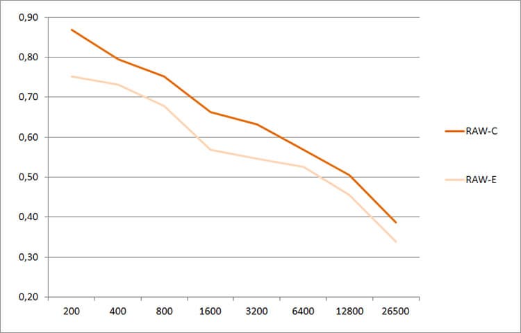 - Дальше мы наблюдаем гораздо более стремительное падение качества, чем наблюдали в тестах Sony Alpha 7 и Fujifilm X-E2.