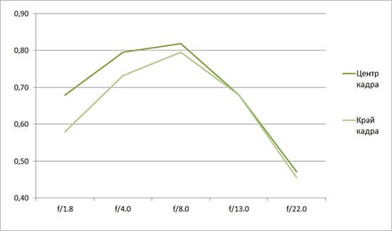 Что радует в этом объективе — почти незаметные геометрические искажения (очень умеренная «подушка») и почти незаметные хроматические аберрации. Кроме того, неплохое разрешение в светосильной области: начиная от f/1,8 и вплоть до f/16,0 разрешение не падает ниже 0,6 линий на пиксель.