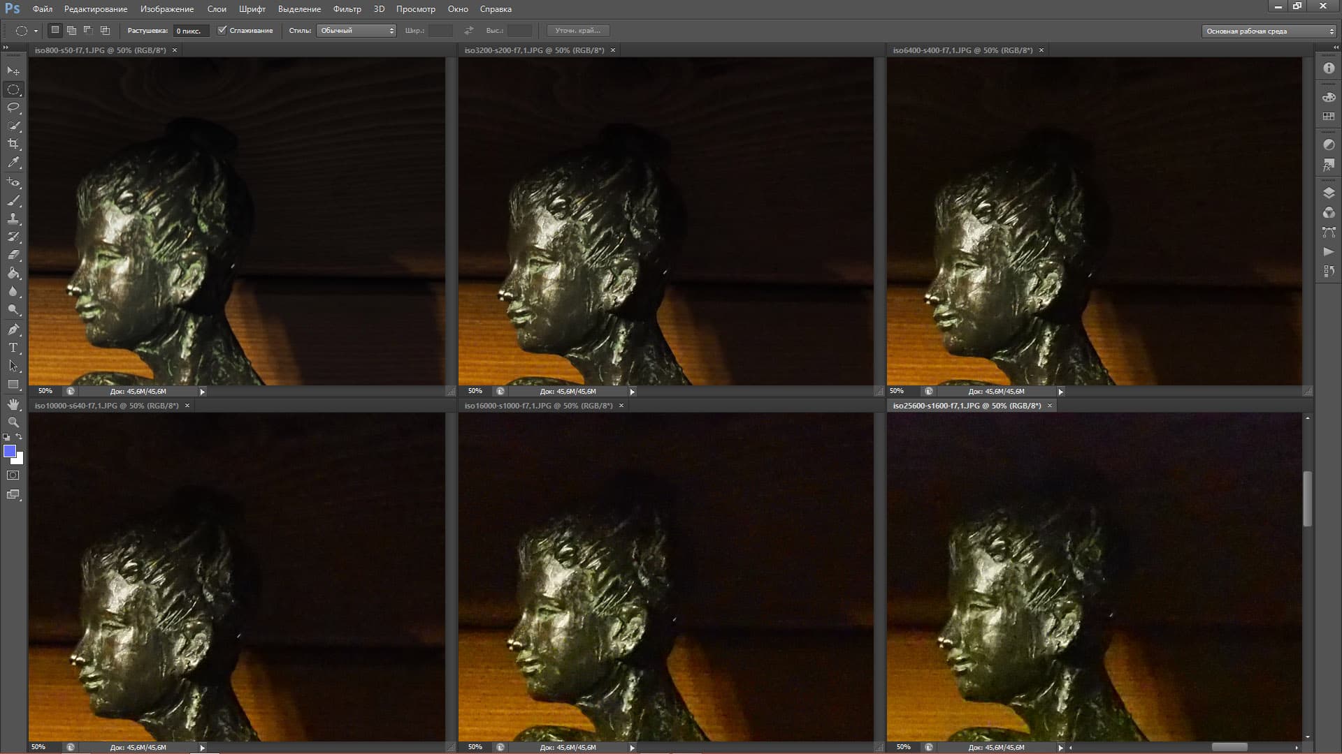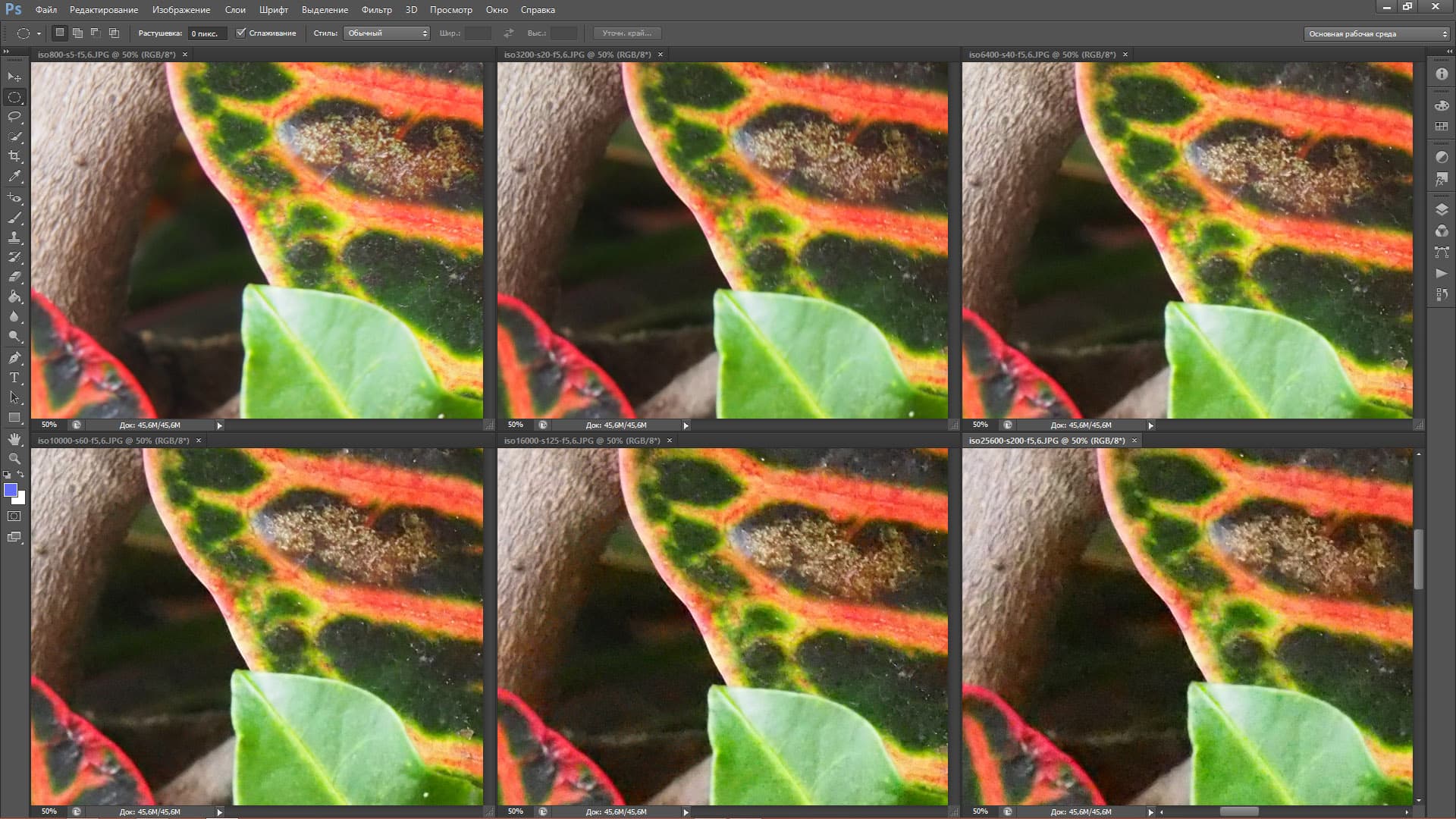 Конечно, одним из первых возникает вопрос — насколько хорошо камера справляется с шумами. Заявления производителя, как бы они ни звучали — радужно или сдержано — требуют проверки. В одном из материалов Рунета я прочел такое утверждение: «… даже матрица E-M5 Mark II осталась той же, что и у E-M5». Может быть и так, но по короткому знакомству с новой камерой у меня создалось впечатление, что она шумит меньше, чем E-M1 и E-M10 (камеры, которые я неплохо изучил). Так что, возможно, матрица у E-M5 Mark II все же новая, а старым осталось только разрешение. Также возможно, что более совершенным стал шумодав. Впрочем, судите сами: в таблице ниже представлены кадры, снятые с чувствительностью ISO 800 — 3200 — 6400 в врехнем ряду и ISO 10 000 — 16 000 — 25 600 в нижнем.