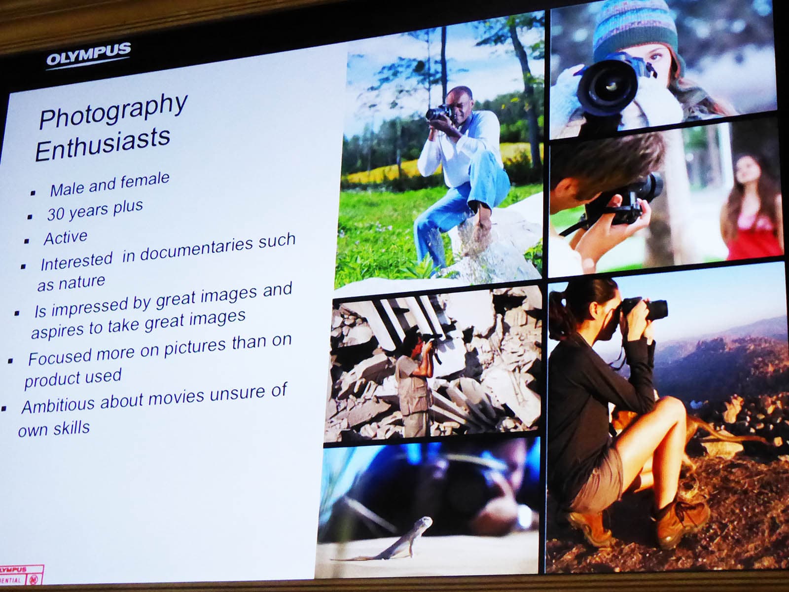 Как уже было сказано, знакомство с Olympus OM-D E-M5 Mark II у меня пока шапочное — хотя на презентации удалось основательно «пощупать» камеру, но знакомство продолжалось всего пару часов. Это недостаточное время, чтобы создалось устойчивое разумное мнение. Все это время думаешь об одном — как сделать тестовые кадры не в лаборатории, а в незнакомом помещении? Так что про особенности камеры сейчас буду рассказывать не я, а представители Olympus. Возможно, по ходу рассказа я смогу добавить что-то вменяемое. Сначала о рынке и целевой аудитории. Да, кстати, слайды презентации при желании можно увеличить (кликнуть).