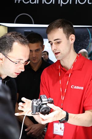 Понятно, что по большому счету эти две камеры никакие не конкуренты, хотя некоторые параметры их близки (скорость серийной съемки со следящим АФ). И посетителям говорилось примерно следующее: «Видите две камеры? Вот эта — чудо для профессионалов. Вы ведь профессионал, да? (фотограф распрямляет плечи и согласно кивает). Поэтому понимаете, что для профессиональной съемки нужен вес, размеры. Тогда будет и точнейший автофокус, и непревзойденное качество картинки. А ваша девушка — энтузиаст, да? (девушка чуть краснеет и согласно кивает). Ей тоже нужна очень мощная камера, но, конечно, не такая тяжелая…» Короче, кем бы ни оказался посетитель, ему несложно было доказать, что Canon EOS 5D IV — великолепна, и что Canon EOS М5 — тоже великолепна.