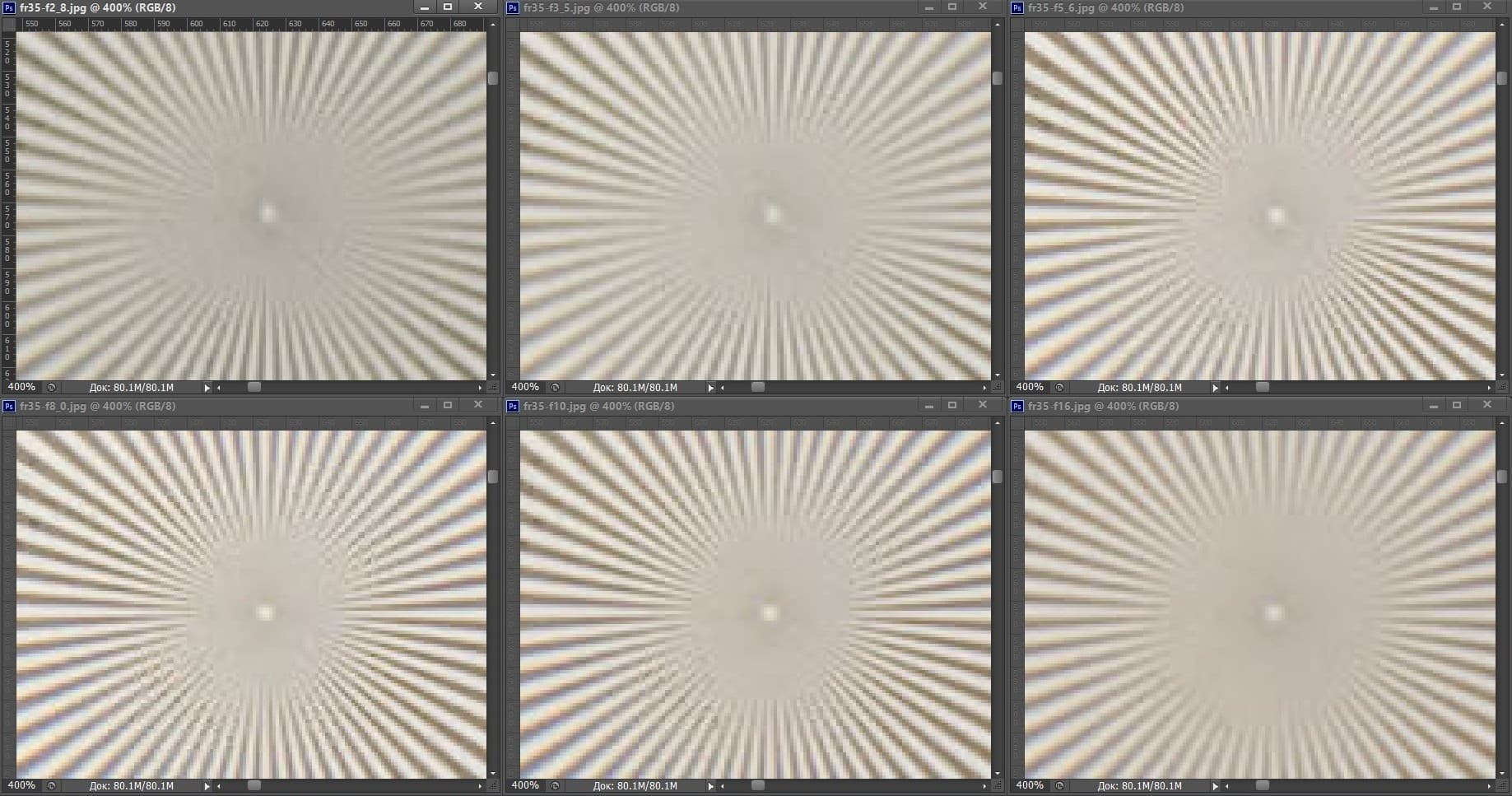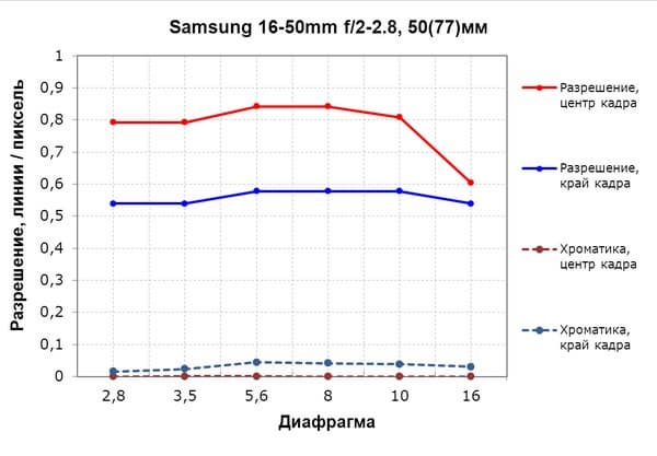 На среднем фокусном расстоянии уровень хроматики на краю становится меньше вместе с разрешением. А вот центр кадра выравнивается очень неплохо, поднимаясь на достаточно высокий уровень.