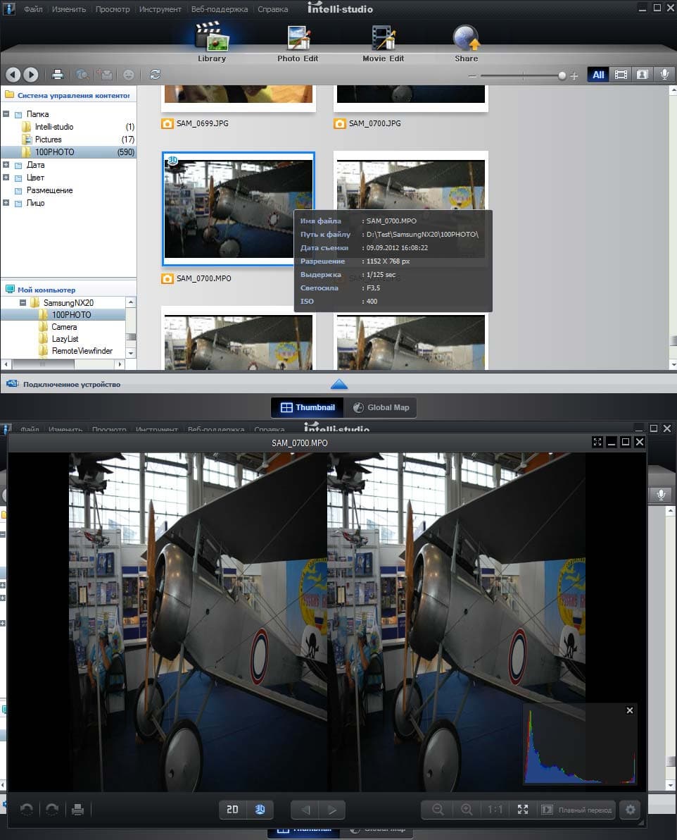 Формат MPO-представления объемных изображений не является экзотическим. Стандартные стереопары, упакованные в него, могут быть без труда «разобраны» на пары JPEG или анаглифические картинки с помощью стороннего ПО. Я пользуюсь MPO Toolbox (описание программы можно найти на сайте stereoscopynews.com). Но у Samsung NX20 объемное панорамное изображение строится не по паре снимков. Программа справляется с псевдо-3D MPO-файлом камеры, но не может конвертировать в анаглифическое изображение панорамный 3D MPO.