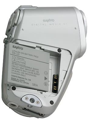 Сначала разберемся с питанием. Используется оригинальный аккумулятор от самого Sanyo на 3,7 вольт емкостью 720 мА·ч. Заряжать его можно двумя способами: либо установив аккумулятор в зарядное устройство (вытащив из камеры) либо установить камеру в док-станцию, а ее, в свою очередь, подключить к блоку питания. Так что если нужно взять камеру в дорогу, то придется для зарядки вытаскивать аккумулятор из нее, что, пожалуй, не очень удобно (особенно учитывая, что кабель питания, выходящий из зарядки не съемный, а вот для подключения к розетке — съемный). Небольшой переходник может использоваться только для питания камеры при съемке в помещении. Правда кабель от зарядки длинной 180 см может несколько ограничивать свободу перемещения (справедливости отметим что общее расстояние «розетка-камера» может достигать 3 м, поскольку есть еще провод зарядка-розетка).
