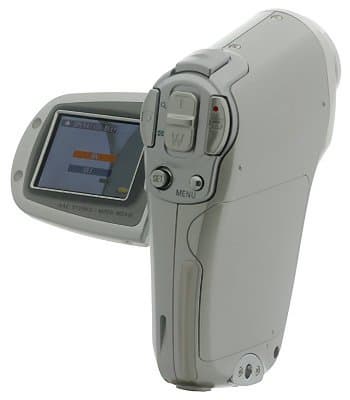 Что касается компоновки, то она скорее напоминает камкордеры, чем классические фотоаппараты. Для наблюдения за объектом съемки используется ЖК-дисплей с количеством точек около 110К (примерно 380×290 точек). Он расположен с левой стороны (если смотреть сзади) и для удобства крутится на 270 градусов (при повороте «вперед» изображение на экране переворачивается). Отметим, что съемка может осуществляться исключительно правой рукой. Так что левшам будет немного сложнее. Однако простота управления и удобство расположения основных кнопок практически нивелируют это неудобство. Под экраном расположена кнопка включения камеры (хотя обычно она находится в режиме stand-by и для начала съемки достаточно просто откинуть дисплей) и динамик. Яркость подсветки экрана можно регулировать. Всего есть восемь позиций (включая полное отключение подсветки).