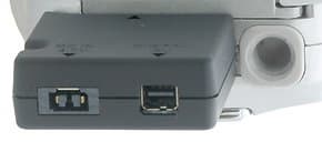 Второе назначение переходника — подключение USB/AV кабеля. Как уже стало популярным в цифровых фотоаппаратах цифровой USB интерфейс совмещен с аналоговым выходом AV (видео и стереозвук). Оба необходимых кабеля идут в комплекте, так что докупать ничего не придется. Заметим, что поскольку отверстие для штатива расположено в непосредственной близости (максимум — пара миллиметров) от разъема, то одновременное их использование — под большим вопросом.