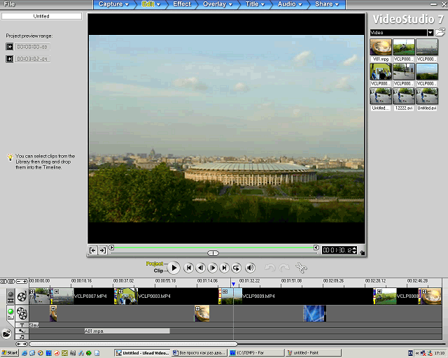 Программу VideoStudio тоже можно легко описать словами «редактор видео» и смысл будет легко ясен. Конечно по возможностям она не дотягивает до профессиональных программ нелинейного видеомонтажа, но заметно лучше входящего в поставку Windows XP минималистского инструмента Movie Maker. В частности присутствуют несколько таймлайнов — для видео, оверлея, текста (заголовка), звука и музыки. Кроме того, есть большая библиотека переходов (43 варианта) и четырнадцать видео фильтров. Так что для редактирования домашнего видео программа вполне подходит. Тем более учитывая простой интерфейс: вся работа происходит в одном окне и состоит из последовательных действий (хотя конечно можно и нарушать данный порядок): Capture, Edit, Effect, Overlay, Title, Audio, Share. Результат можно записать в AVI или MPEG файл или сразу на оптический носитель в формате VCD/SVCD/DVD (включая создание меню, пользовательского или из шаблонов).