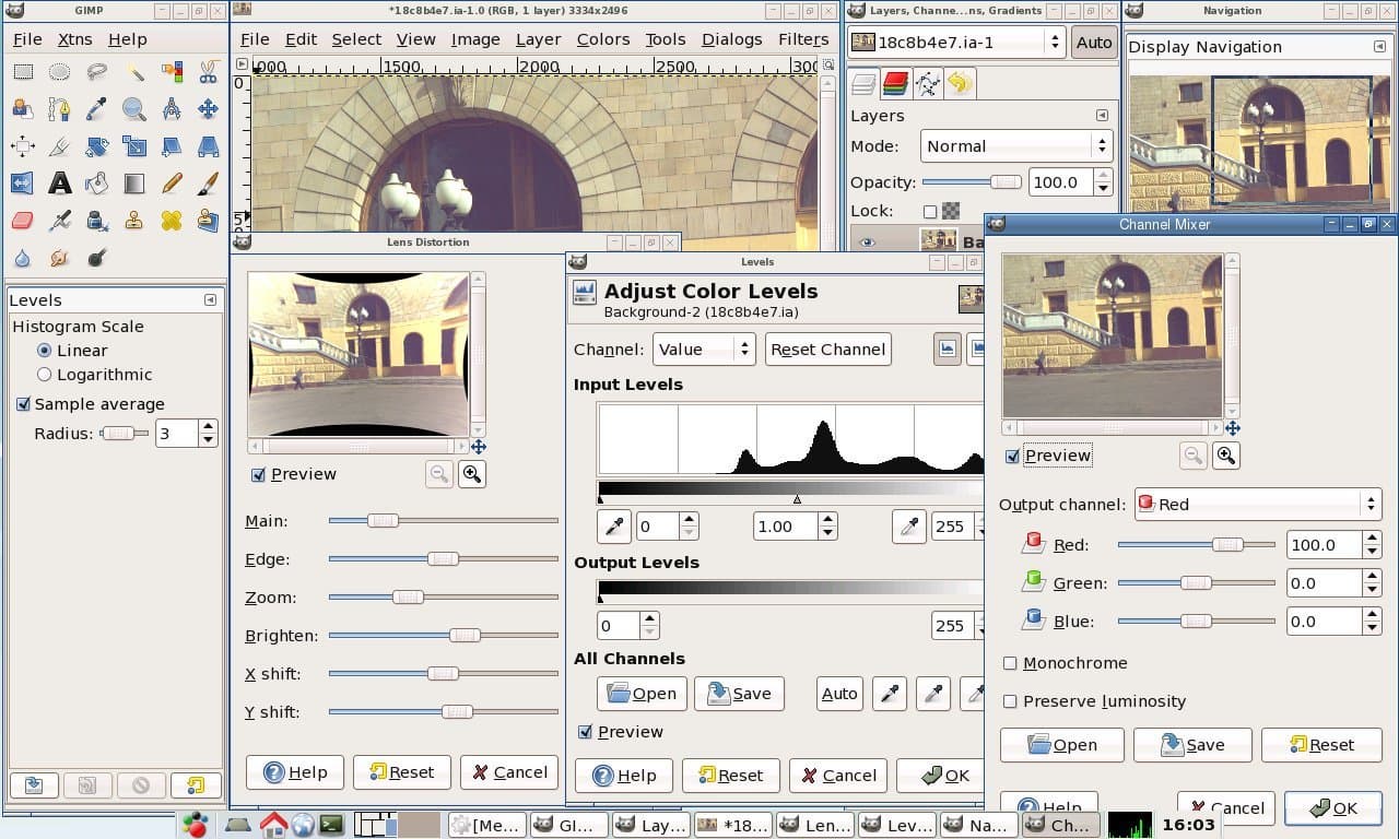 Програма GIMP 2.3. Это промежуточная версия от стабильной 2.2 к будущей 2.4. Обращаю внимание, что для нее есть фильтр, позволяющий исправлять дисторсию, виньетирование и преспективные искажения.