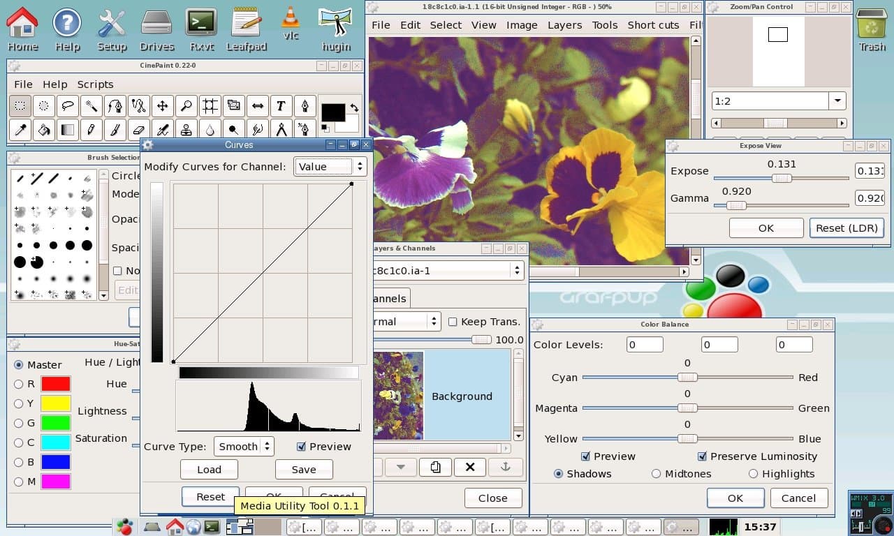 Эта программа, как и ее оболочка UFRaw, платформонезависимая. Поэтому с равным успехом ими можно восполльзоваться и на машинах, на которых установлен Windows, и на машинах с Linux. Отличительной особенностью рассматриваемого задника является его автономность и возможность работать вне студии и без подключенного к нему компьютера. Поэтому вполне реальна ситуация, когда вы отправились на съемку, не взяв с собой ноутбука с Macintosh. Но все же, может возникнуть ситуация, когда отснятые кадры надо хоть в каком-то виде просмотреть, скопировать и обработать на первом подвернувшемся компьютере. Хотя стоимость компьютера ничтожно мала по сравнению со стоимостью задника и камеры и приобретение компьютера фирмы Apple и его настройка, вряд ли остановят кого-то из владельцев этого задника, тем не менее всегда хорошо иметь аварийный вариант, чтобы хоть как-то обработать кадр, который нужен сегодня с газетным качеством, а не завтра во всей красе. Таким аварийным решением может стать загрузочный CD диск c операционной системой и необходимыми программами. Практически готовым решением в этом случае может стать Grafpup Linux 2.0 beta. Эта система интересна своимм маленьким объемом (около 100 МБ), возможностью работать практически на любом компьютере, не устанавливая операционную систему на жесткий диск, легкостью модернизации и возможностью создавать собственные варианты загрузочного диска с дополнительно установленными программами. Несмотря на то, что приставка beta свидетельствует об экспериментальном и нестабильном характере программы, в данном случае мы имеем достаточно работоспособную систему, отличительной особенностью которой являются входящие в комплект последние экспериментальные версии графических редакторов GIMP 2.3 и Cinepaint 0.22. Именно они, вместе с последней версией UFRaw, позволяют открывать файлы с расширением AI, а Cinepaint — даже редактировать их в 16-битном представлении. Таким образом, по функциональности система приближается к возможностям, которые дает Photoshop. Это не значит, что она обеспечивает тот же комфорт, но при некотором терпении и упорстве можно сделать почти все необходимое.