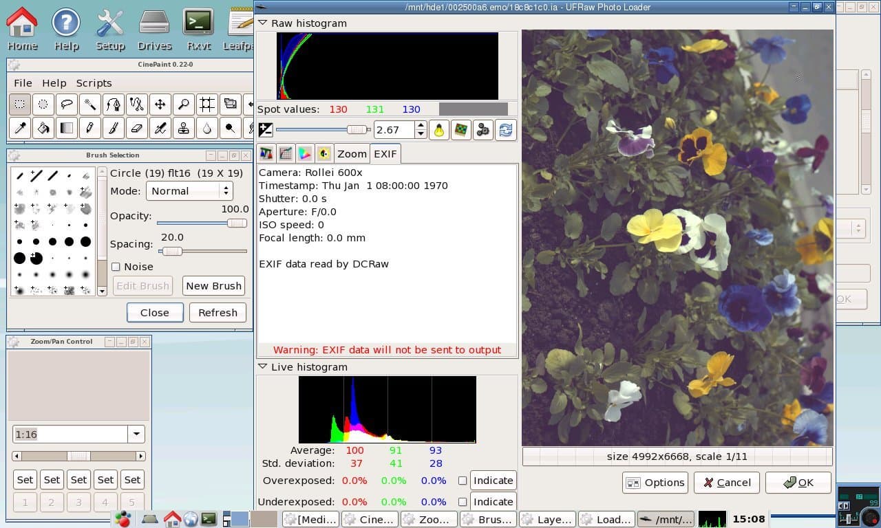 Модуль UFRaw, запущенный из графического редактора CinePaint Film Gimp, позволяет открыть файл, созданный задником, и даже прочитать заголовок EXIF, который, впрочем, практически не содержит информации.