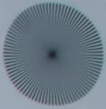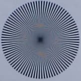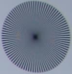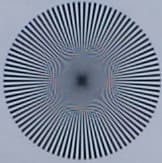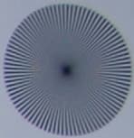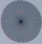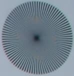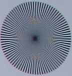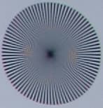 Фотографирование миры производилось с расстояния 3 метра, диаметр миры 13 см. Освещение двумя люминесцентными лампами (14 Вт). Слева приведён снимок миры по центру кадра, справа — верхний правый угол. Фокусное расстояние 18 мм.