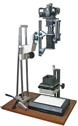 Устройства можно разделить на две основных группы: установки для пересъемки 1:1 и фотоувеличители. На нижеприведенной фотографии изображена классическая конструкция, состоящая из аппарата Зенит, приставки для макросъемки ПЗФ, объектива Гелиос-44 и приставки диарепродукционной ПД.