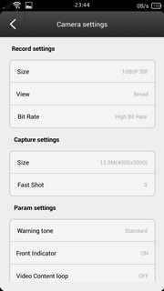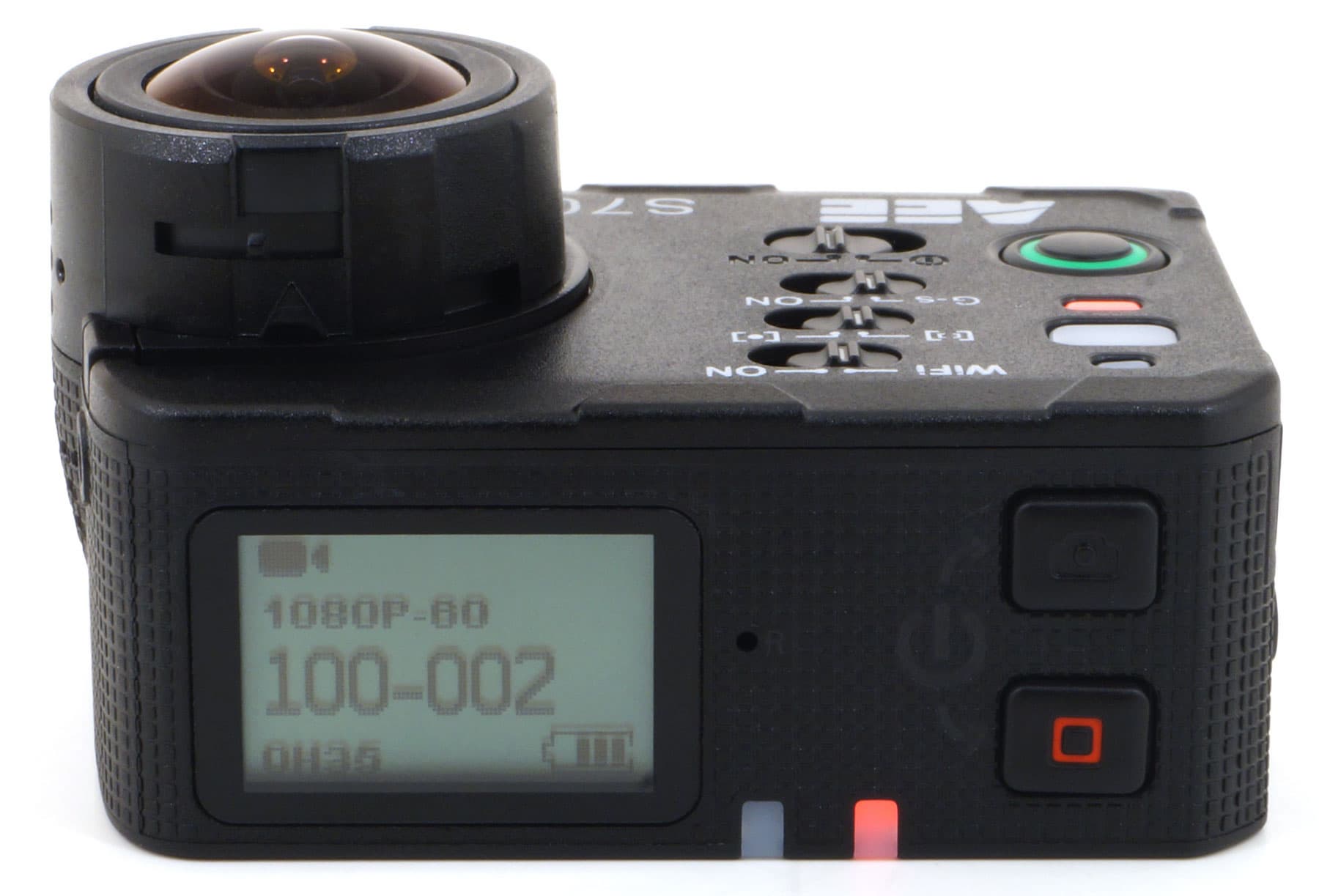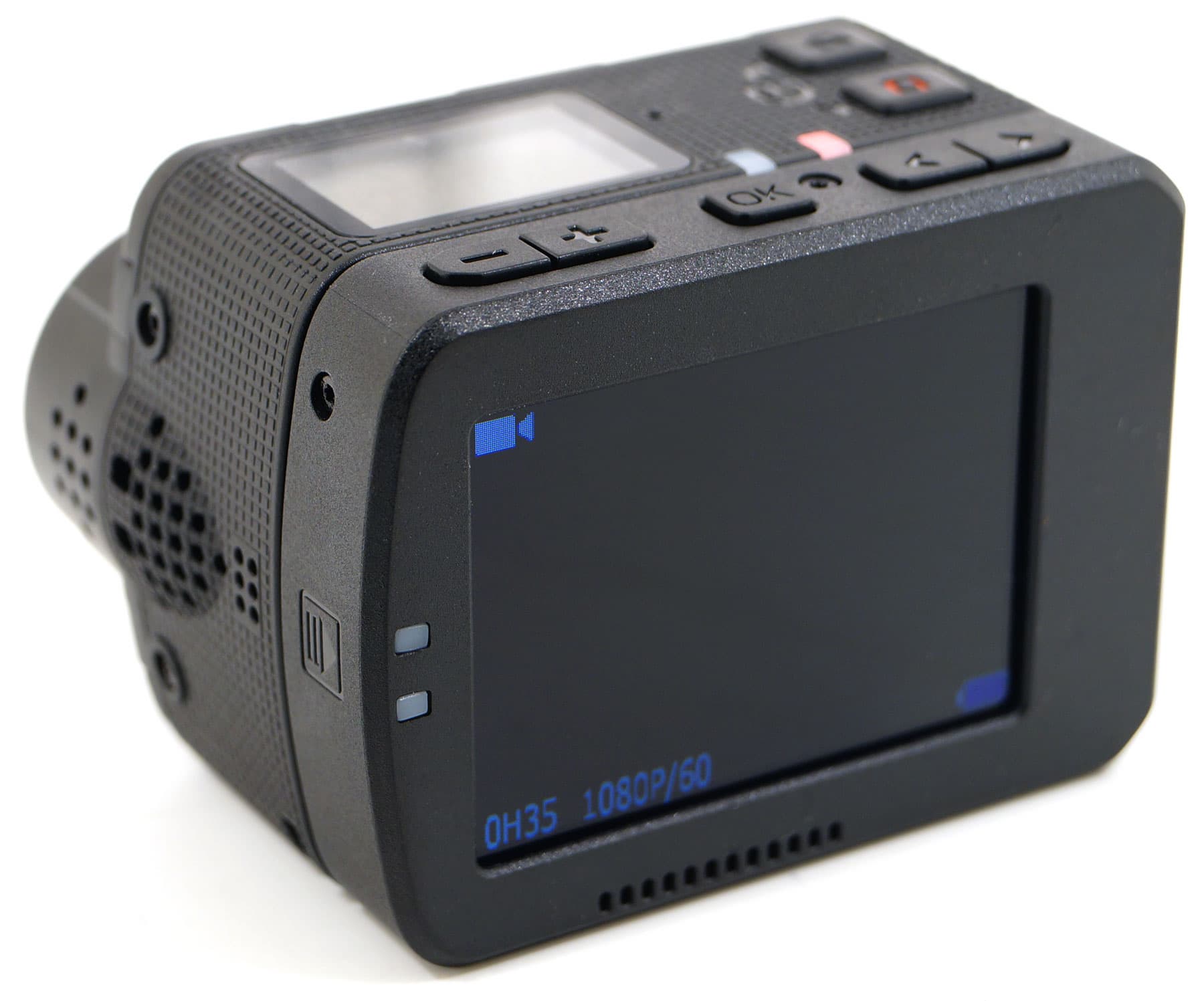 Верхняя панель корпуса содержит две управляющие кнопки, с помощью которых (как в GoPro) производится в том числе и навигация по меню с выбором основных параметров. Яркость экранчика, где отображается информацию о текущем состоянии камеры, позволяет без труда прочесть или изменить настройки при любой освещенности.